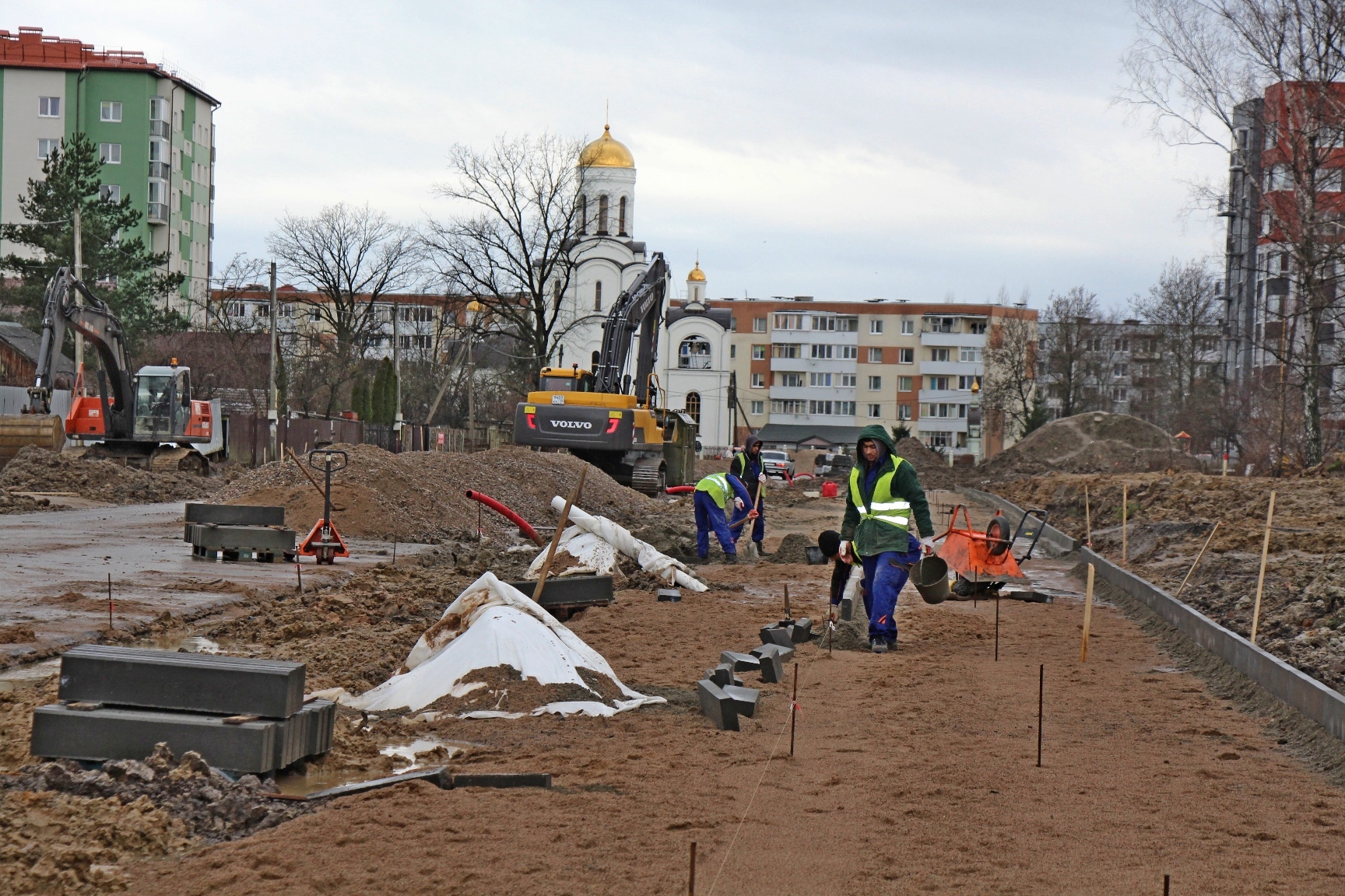 Со стороны ул. Лукашова выставляют бордюры на будущих тротуарах и велосипедных дорожках и готовят песчаное основание. На месте непосредственного примыкания к ул. Лукашова в выходные планируют демонтировать отключенные элементы сетей энергоснабжения.