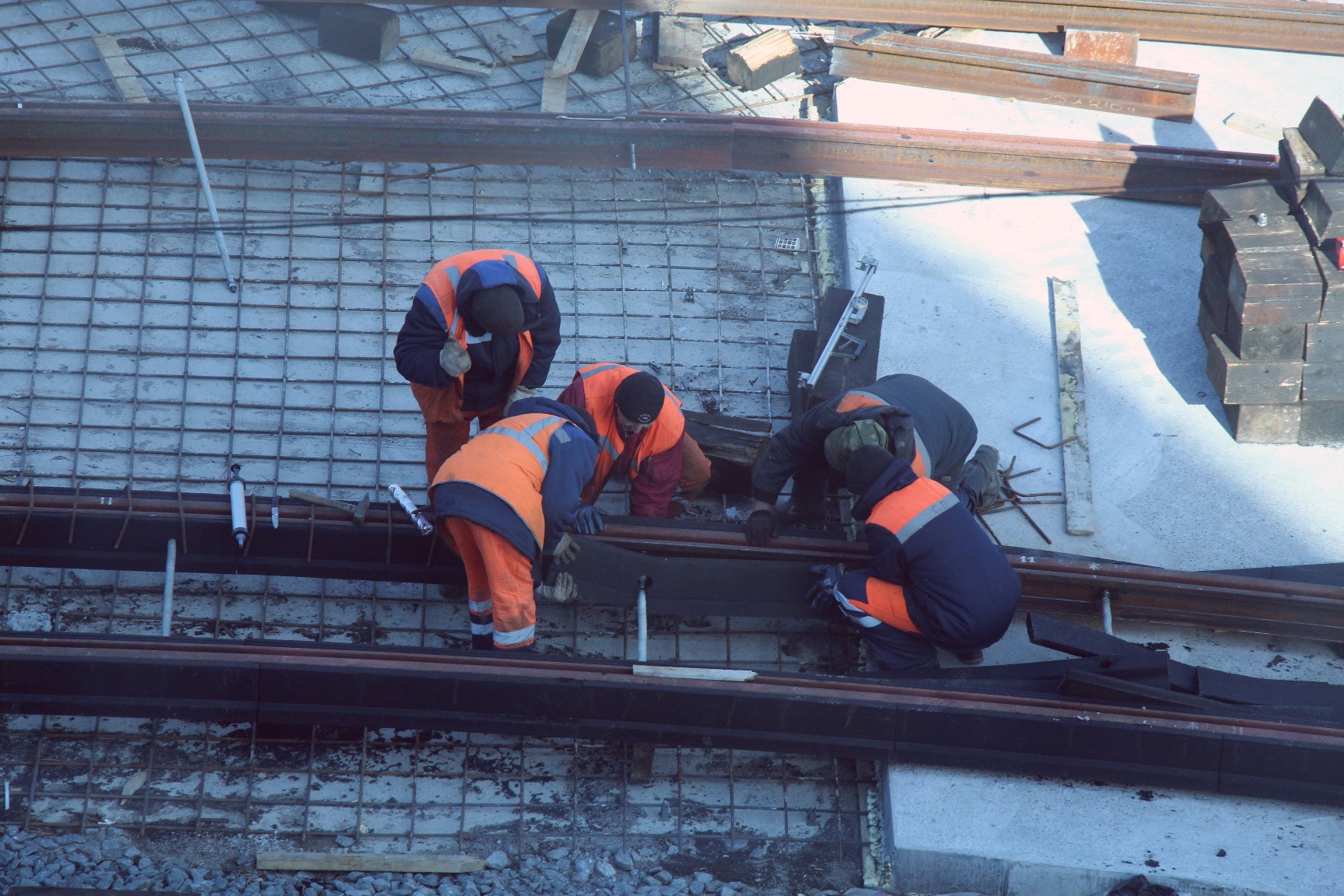 Сейчас они стыкуют новые рельсы с действующими на направлениях: площадь Калинина, Ленинский проспект, ул. Киевская. Подготовлено нижнее бетонное основание, путейцы готовят рельсы к точному выставлению по высоте на порталах для бетонирования.