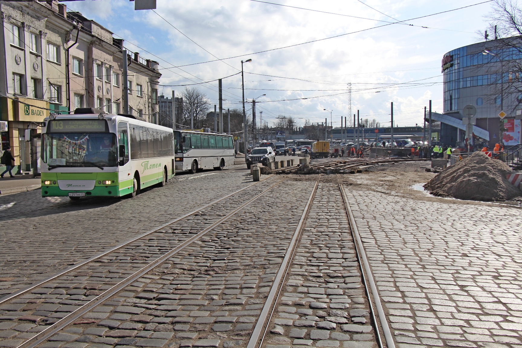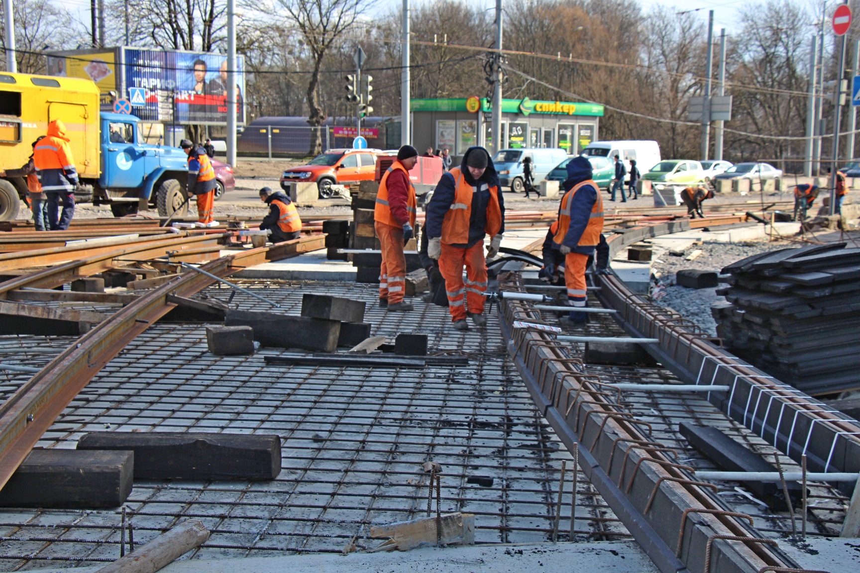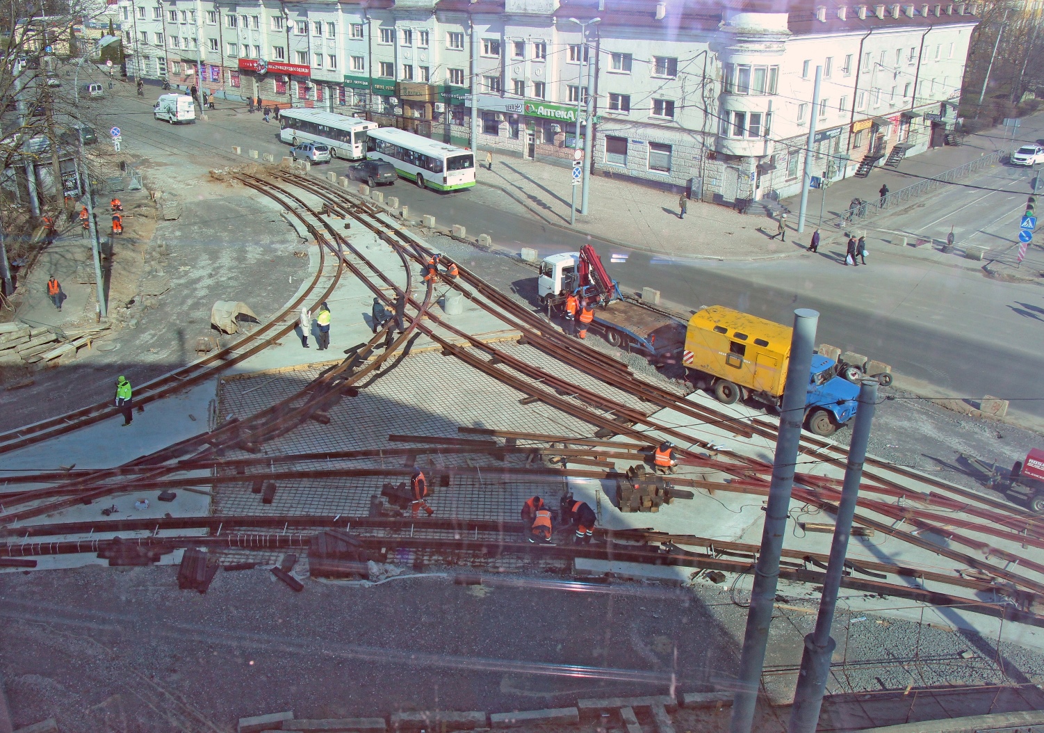 На перекрёстке ул. Киевской с проспектом и площадью Калинина монтажники МКП «Калининград-ГорТранс» продолжают кропотливо формировать будущие стрелочные узлы.