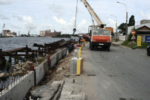 По сообщению городской пресс-службы, об этом сообщил на выездном брифинге директор МКП «Управление капитального строительства» Артур Крупин. Данный проект реализуется в рамках Федеральной целевой программы развития Калининградской области на период до 2014 года. Работы на объекте продолжились в июле после получения первого транша финансовых средств из федерального бюджета. Сейчас на набережной устанавливается опорная береговая стенка, ведется вскрытие старого дорожного покрытия, демонтируется брусчатка, прокладываются водопровод, дождевая канализация, электрокабель. Как подчеркнул Артур Крупин, ливневка здесь будет с очистными сооружениями. Тем самым прекратится сброс неочищенных стоков в Преголю.