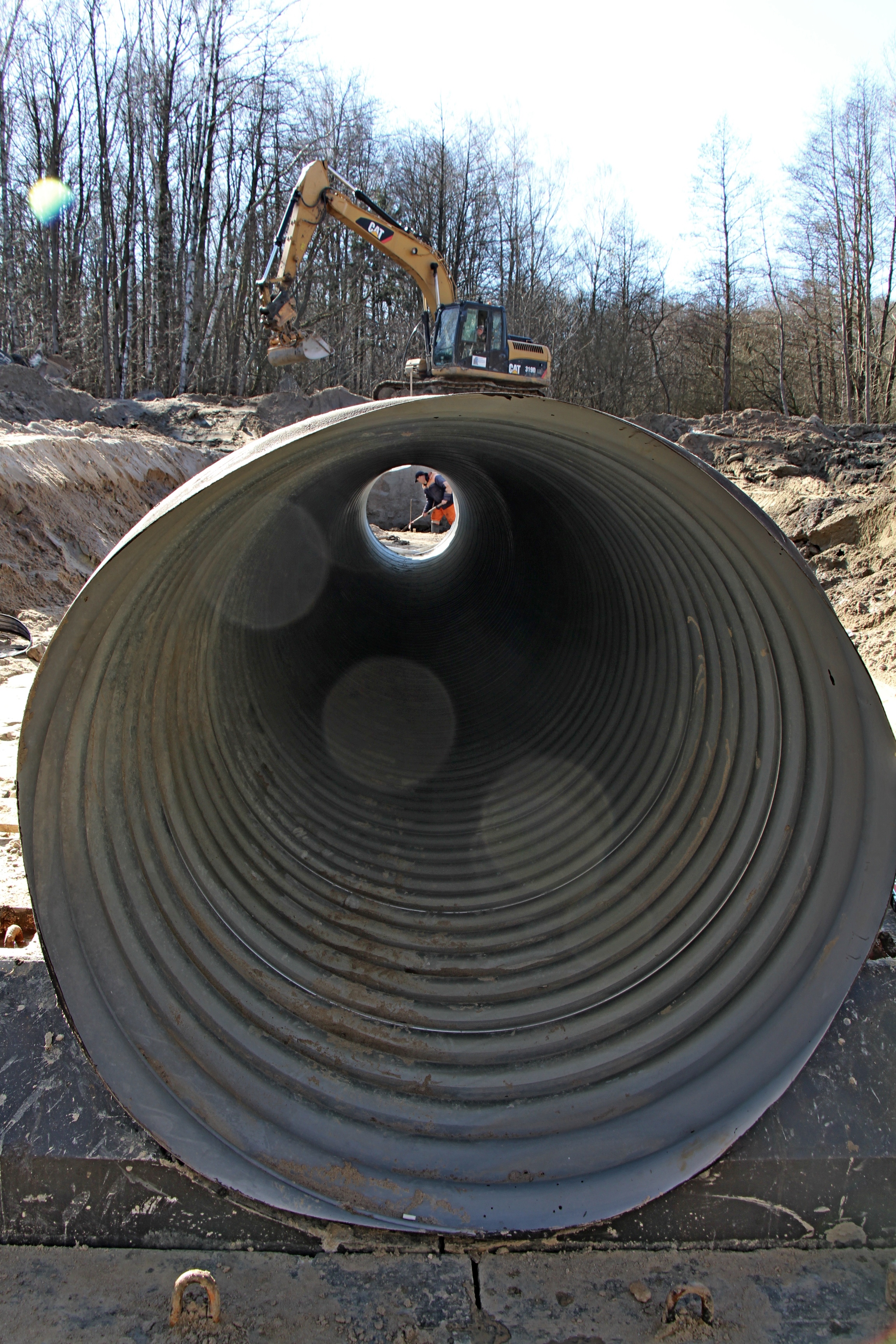 По металлической гофрированной трубе диаметром 1,2 метра направят под насыпью лесной ручей. Сейчас в подготовленной выемке уже уложено первое звено, всего их будет смонтировано три.