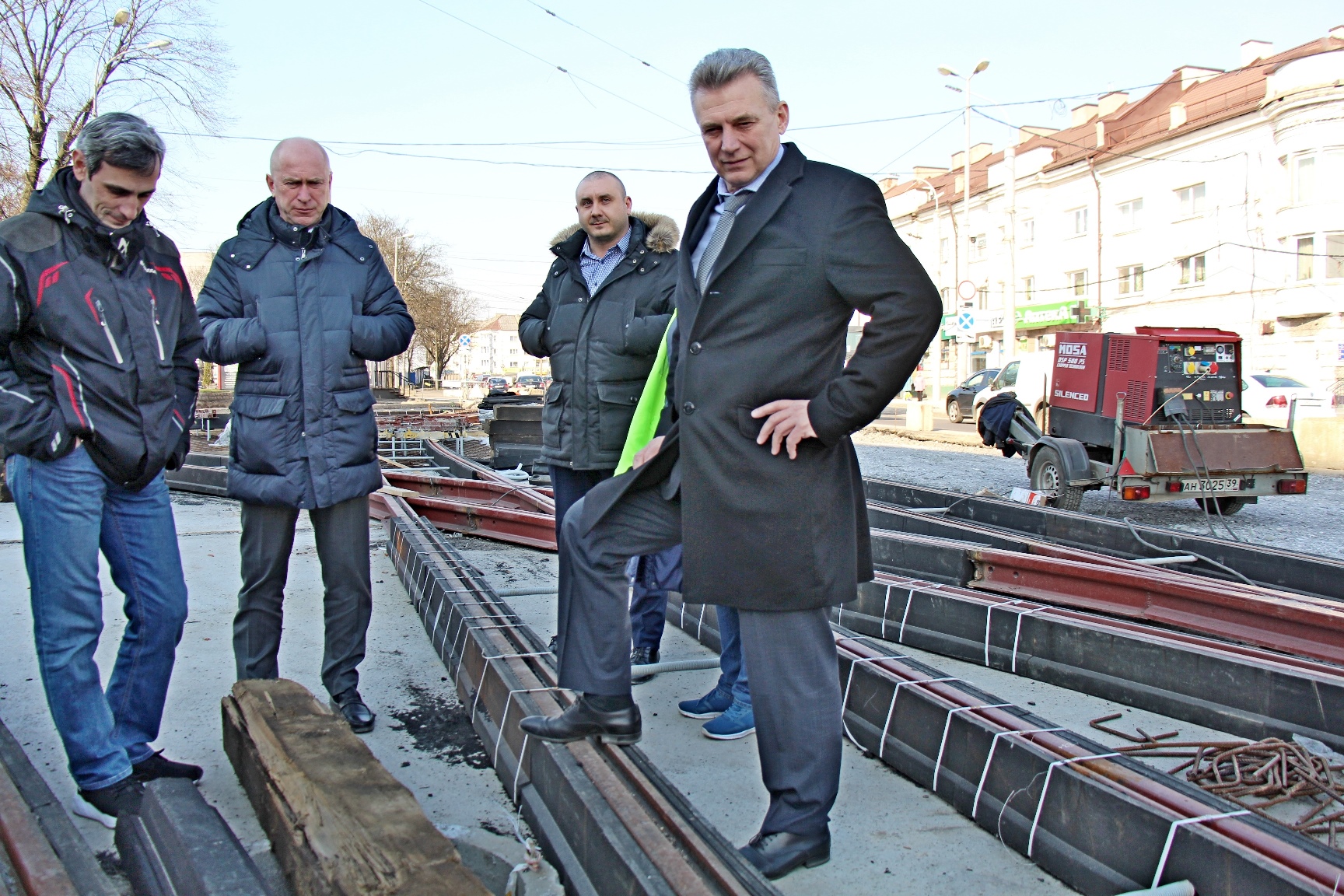 На пересечении ул. Киевской с проспектом Калинина и Ленинским проспектом путейцы продолжают выставлять на порталы, изолировать резиной и бетонировать стрелочные переводы и рельсы. На новых опорах в районе перекрёстка монтируют новые светильники. На следующей неделе на перекрёсток рассчитывают выйти дорожники, чтобы приступить к подготовке основания под асфальт.