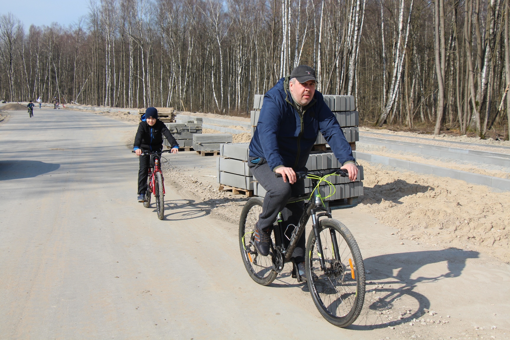 Тем временем активно продолжается установка бортового камня. Он уже чётко обозначил границы тротуаров, зелёной зоны и велодорожек по обеим сторонам Планерной. Но уже сейчас, задолго до сдачи, дорогу уже активно используют и пешеходы, и велосипедисты, что говорит о востребованности будущей трассы.