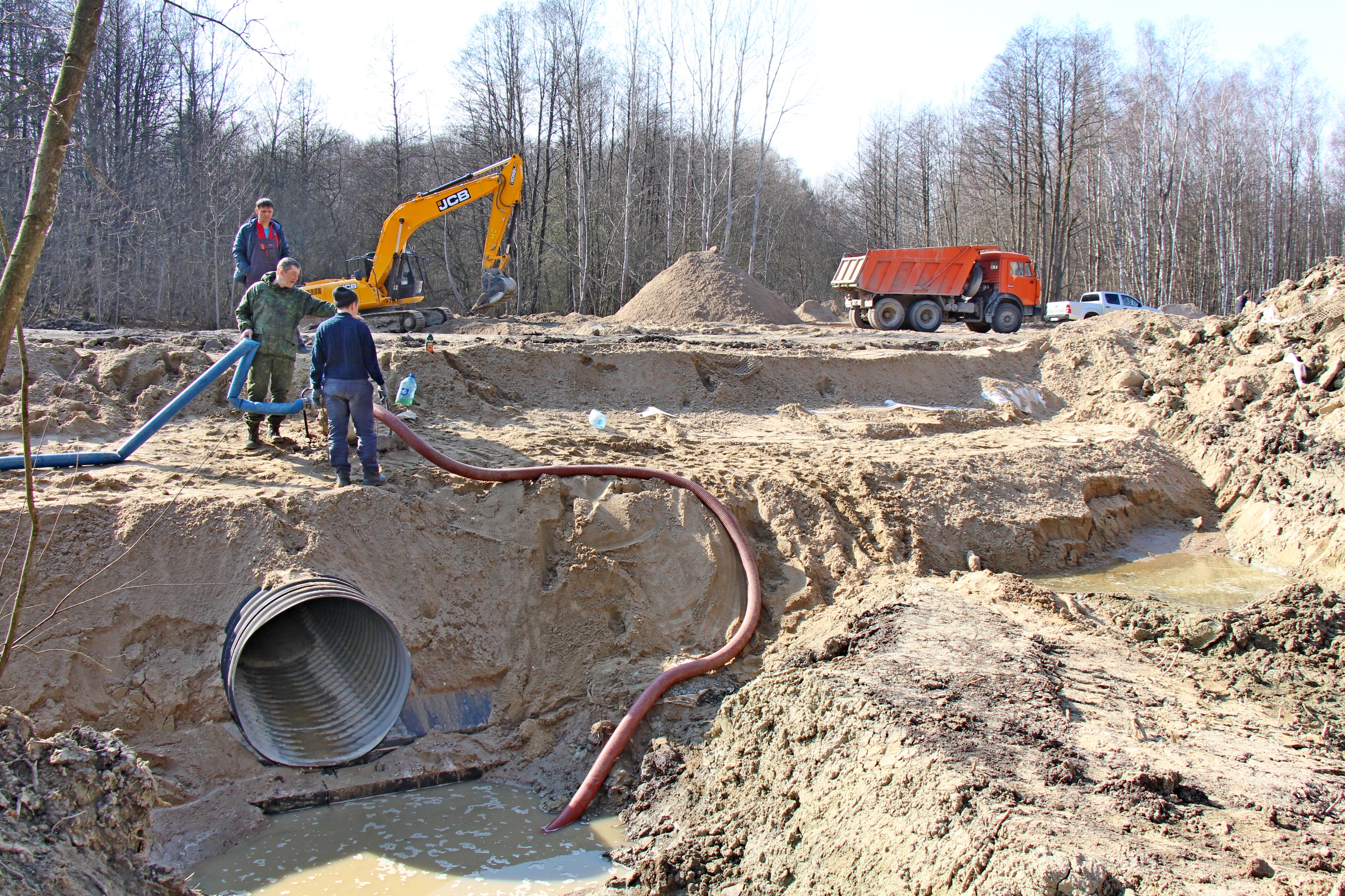 Два из трёх звеньев гофрированной металлической трубы диаметром 1,2 метра уже уложены на своё место, после укладки третьего звена лесной ручей пропустят под дорогой. Затем разорванные раскопкой две части дорожного полотна соединят и продолжат подготовку к укладке асфальта.