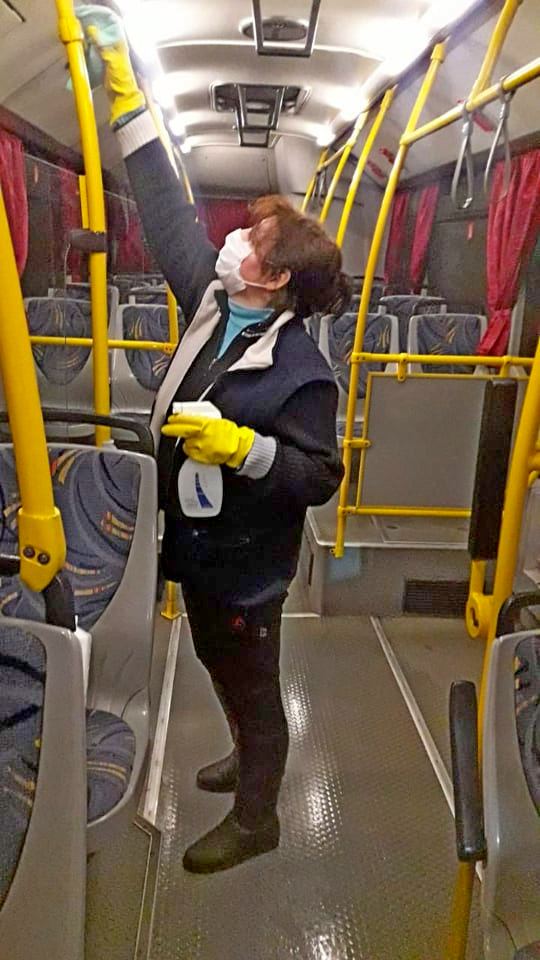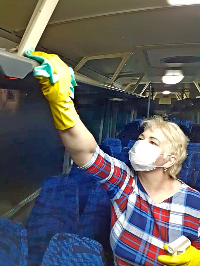 Согласно рекомендациям Роспотребнадзора, в пассажирских предприятиях, кроме влажной уборки, налажена дезинфекционная обработка салонов автобусов, троллейбусов, трамваев и маршруток. Полное обеззараживание проводится после смены в условиях «стационара», в депо и в гаражах. В рекомендациях содержится перечень средств из различных химических групп: хлорактивные; кислородактивные; катионные поверхностно-активные; спирты.