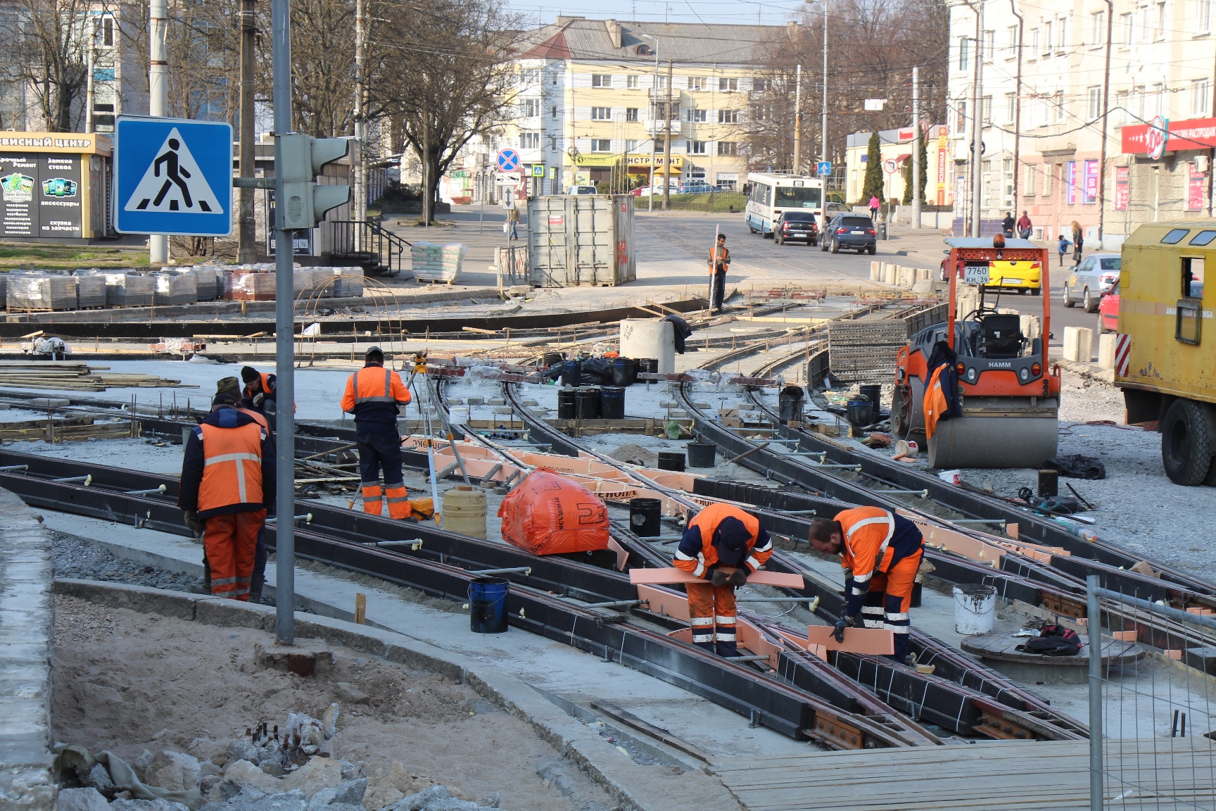 На перекрёстке Киевской-Калинина путейцы устанавливают опалубку под бетонирование трамвайных рельсов, а дорожники начали асфальтировать тротуар.