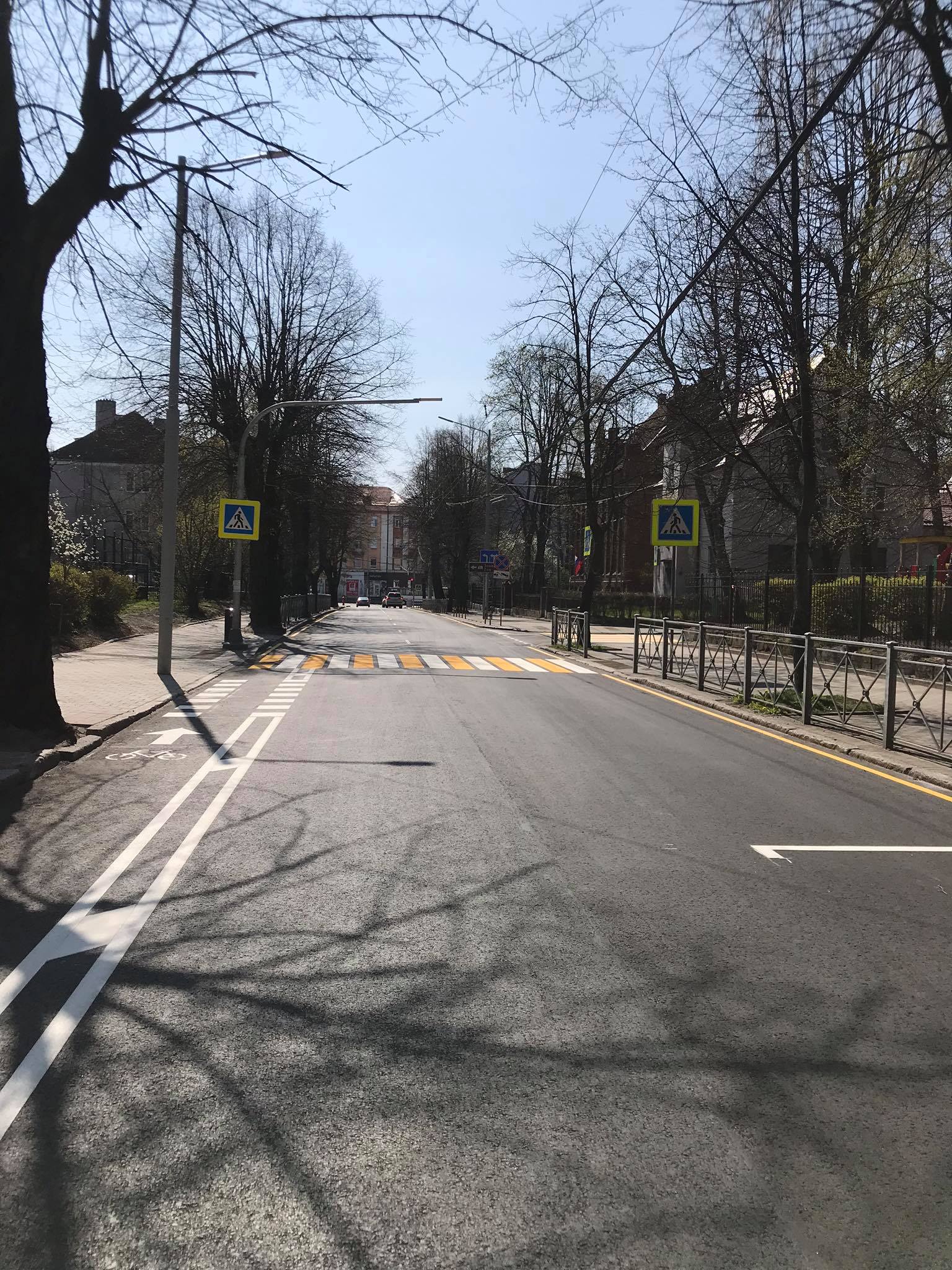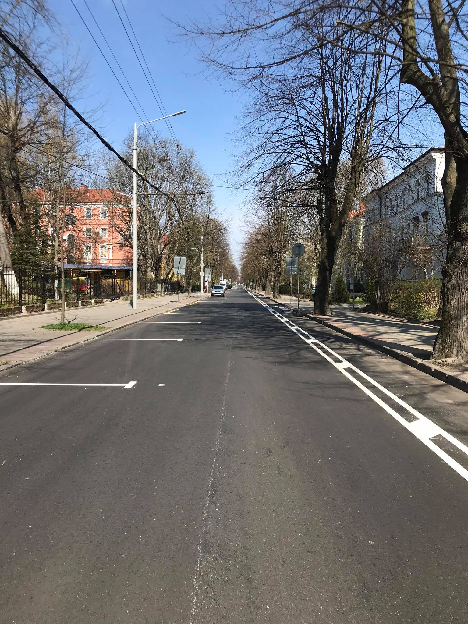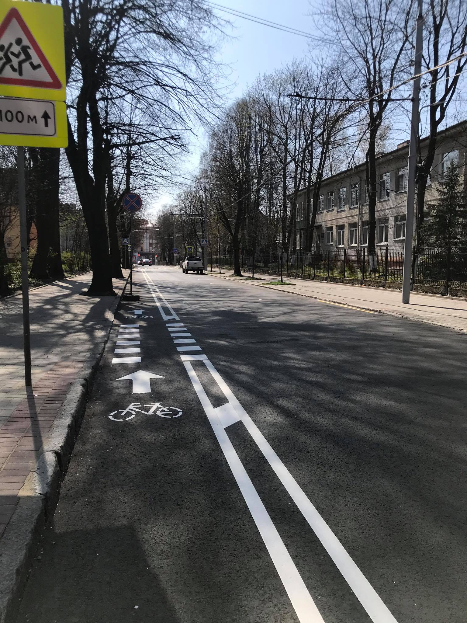 В апреле разметку пластиком выполнили на обновлённой ул. Комсомольской. Калининградцы обратили внимание на то, что на улице с односторонним движением разнесены полосы для транспорта и велодорожки, обозначены места для парковок, где они не мешают автобусам и троллейбусам.