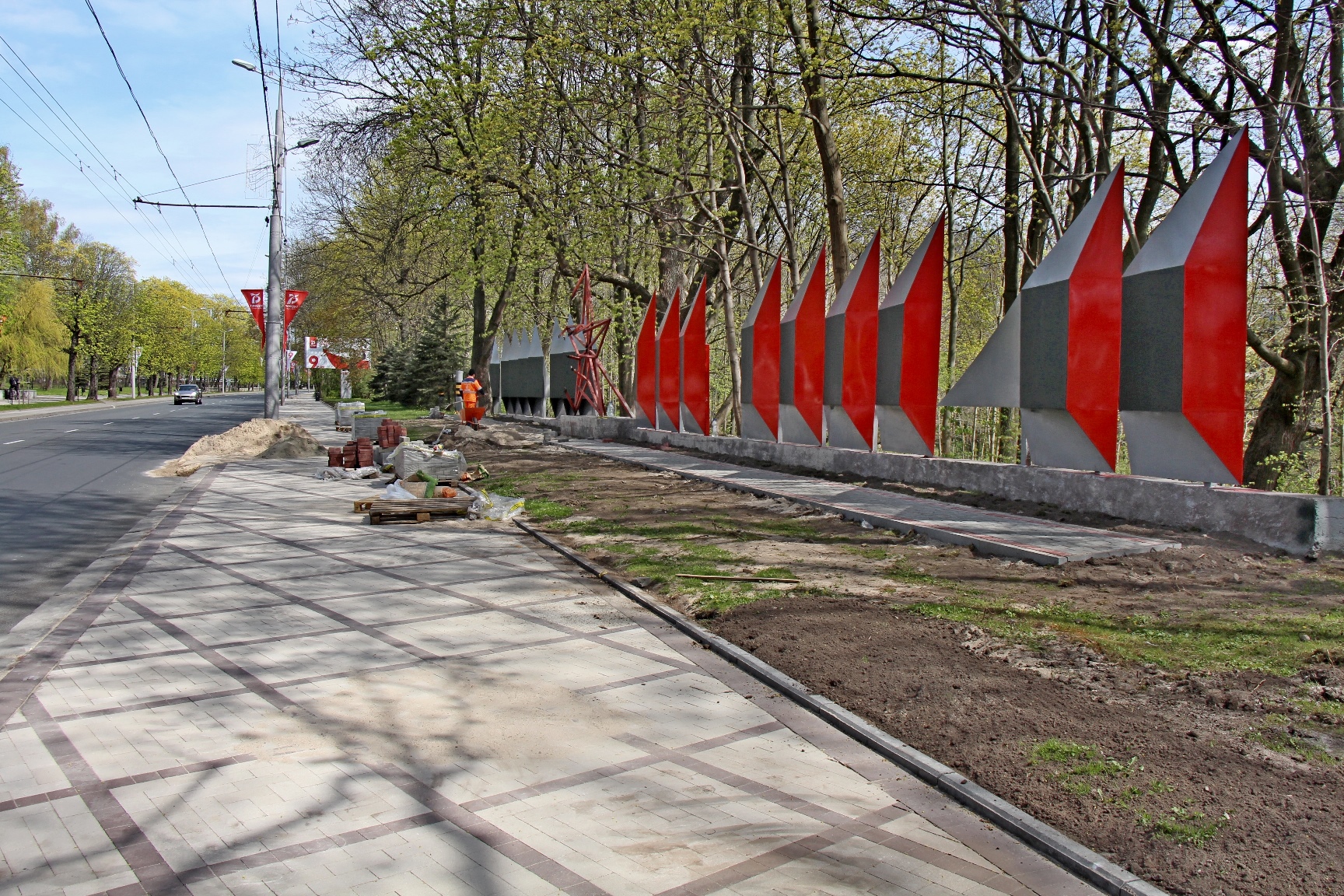 Гвардейский проспект теперь с обеих сторон обрамлён двухцветными тротуарами из плитки. Сейчас рабочие заканчивают укладку плитки у завода «Газавтоматика», ремонт подпорной стенки и благоустройство.