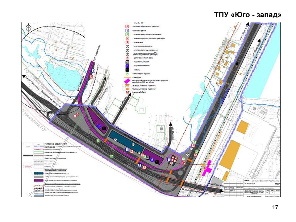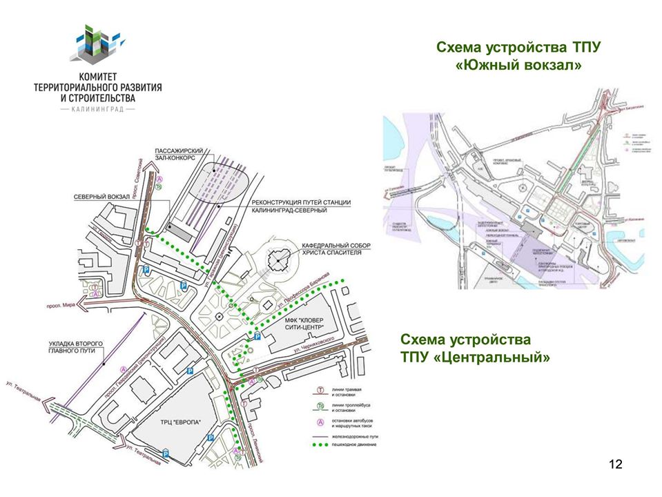 В том числе генплан предполагает создание и дальнейшее развитие системы транспортно-пересадочных узлов (ТПУ). Их появление на территории городского округа является одной из наиболее значимых составляющих развития транспортной системы. Процент автомобилизации населения Калининграда является одним из самых высоких в стране. А расширить дорожную инфраструктуру в центре города нельзя из-за невозможности сносить жилые дома. Одним из решений этой проблемы, избавления города от пробок и могут стать ТПУ (генпланом предусмотрены территории под 11 узлов, два из них на Южном и Северном вокзалах) .