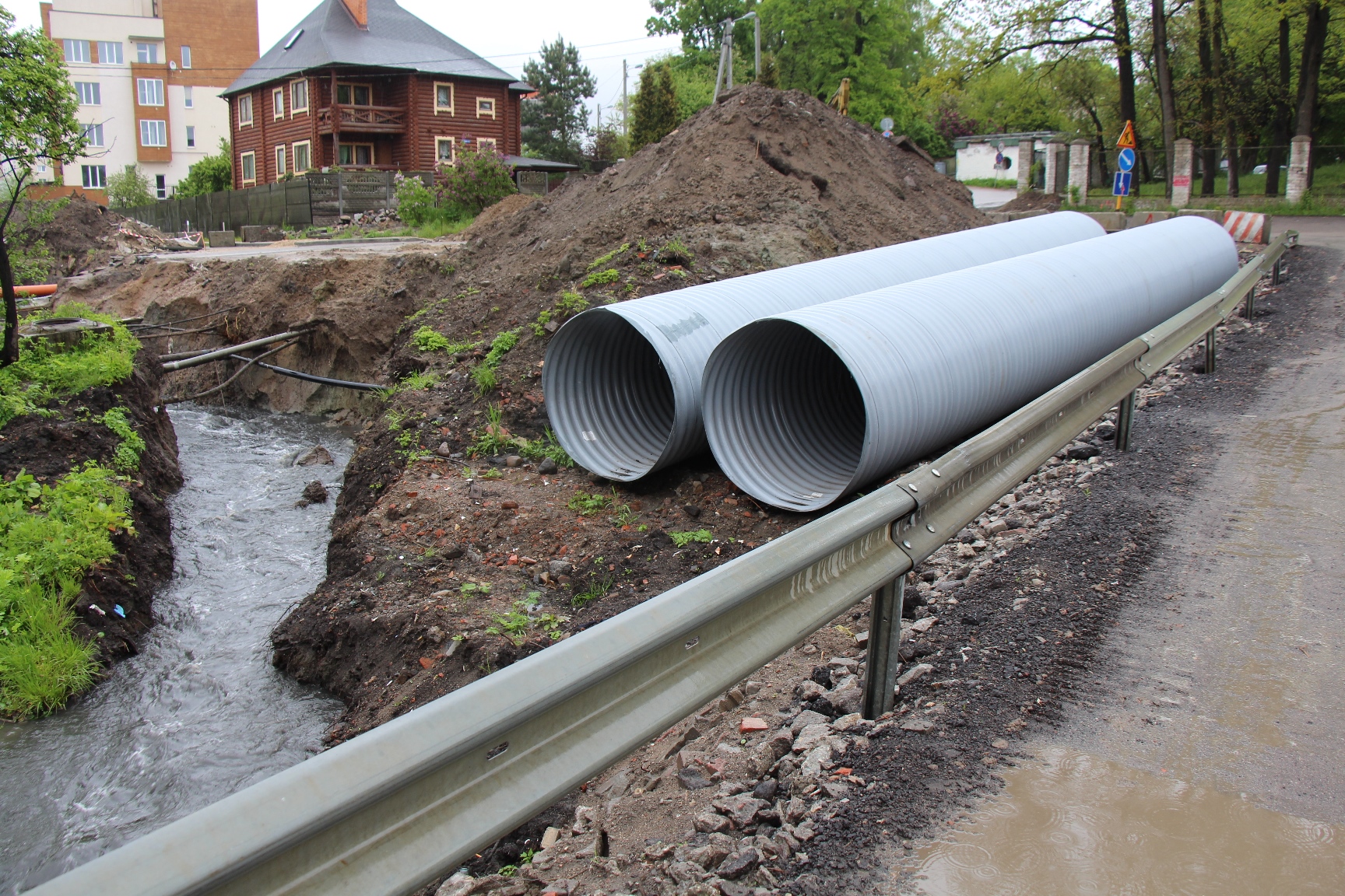 На Дачной, со стороны Гагарина, за временным мостом через ручей, ведут подготовительные работы на повороте на Стрелецкую. В этом месте через ручей переброшено большое число действующих инженерных сетей – от кабелей до канализации. Своего часа дожидаются металлические гофротрубы, которые лягут в русло ручья под будущим трубопереходом.