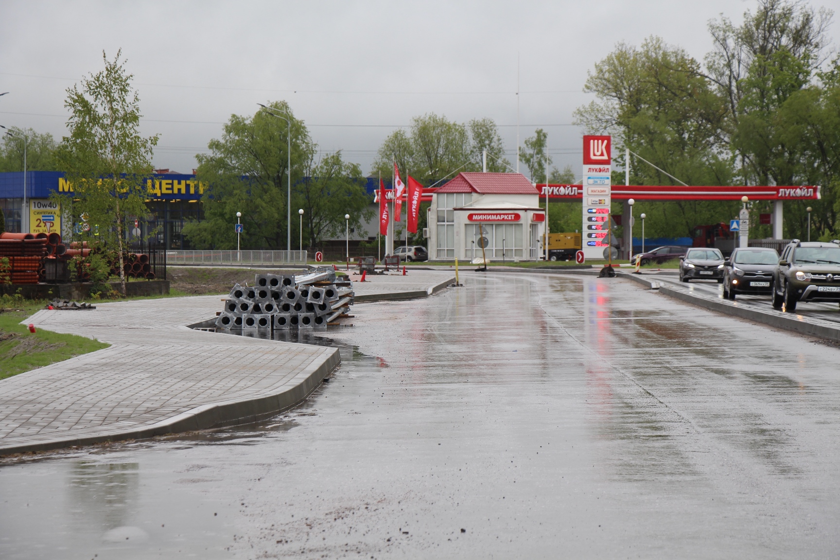 С противоположной стороны объекта, со стороны Московского проспекта, идет подготовка дорожного основания у поворота на Физкультурную, а от налоговой инспекции мимо торгового центра на проезжую часть уже уложен нижний слой асфальта.