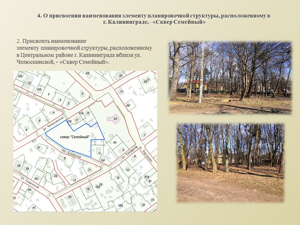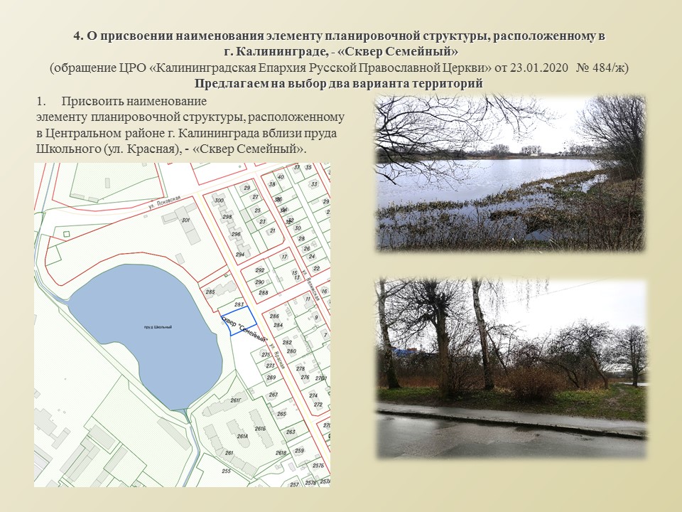 К такому вопросу, требующему дополнительного изучения, относится утверждение места и названия для сквера с условным пока топонимом «Семейный» или «Сквер семьи». Идея создания такого сквера принадлежит Калининградской епархии русской православной церкви, которая обратилась в администрацию. По сути названия никто из членов комиссии не возражал, все оказались едины во мнении, что Калининграду нужен уголок, отражающий семейные ценности, который был бы соответствующим образом оформлен, в том числе, там может располагаться какая-то скульптура на тему семьи. Но в плане того, где в областном центре такой сквер разместить, мнения разошлись.