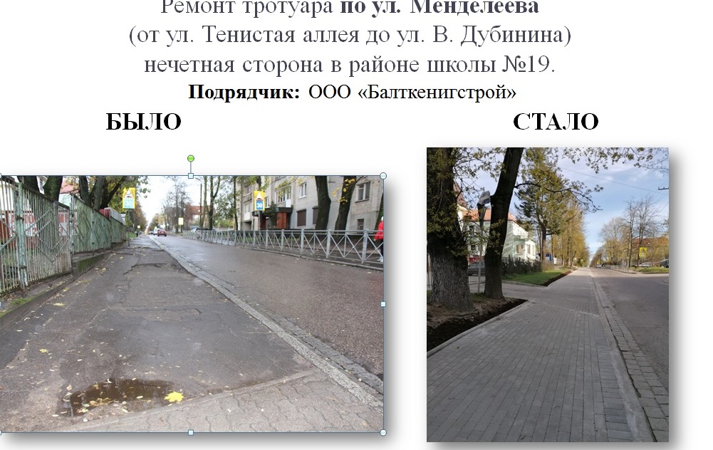 - ремонт тротуара по ул. Менделеева (от ул. Тенистая аллея до ул. В. Дубинина) нечетная сторона в районе школы №19;