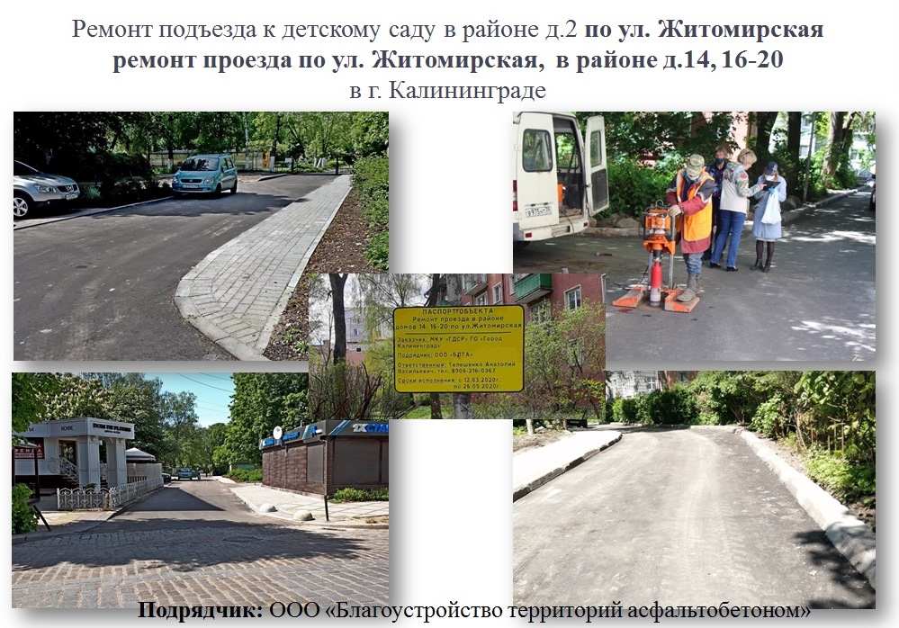 - ремонт проезда в районе домов №№14, 16-20 по ул. Житомирской и подъезд к детскому саду №111 (работы по благоустройству). Срок реализации по контракту - до 30 мая 2020 г.