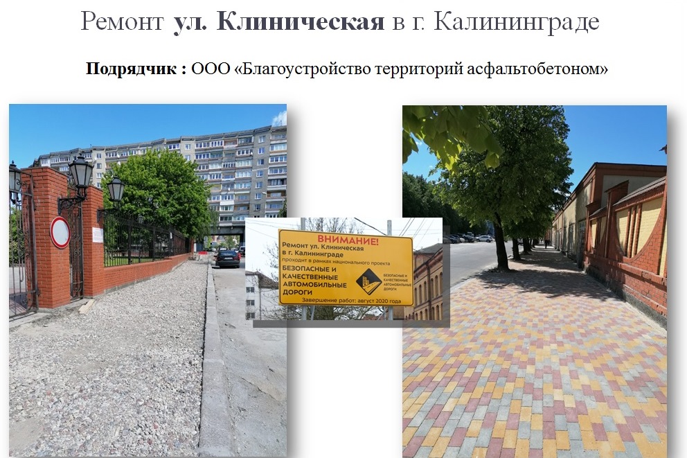 - ремонт ул. Багратиона, от Ленинского проспекта до ул. Октябрьской (установка бортового камня, устройство основания на тротуаре). Срок выполнения работ – до 15 сентября 2020 года.