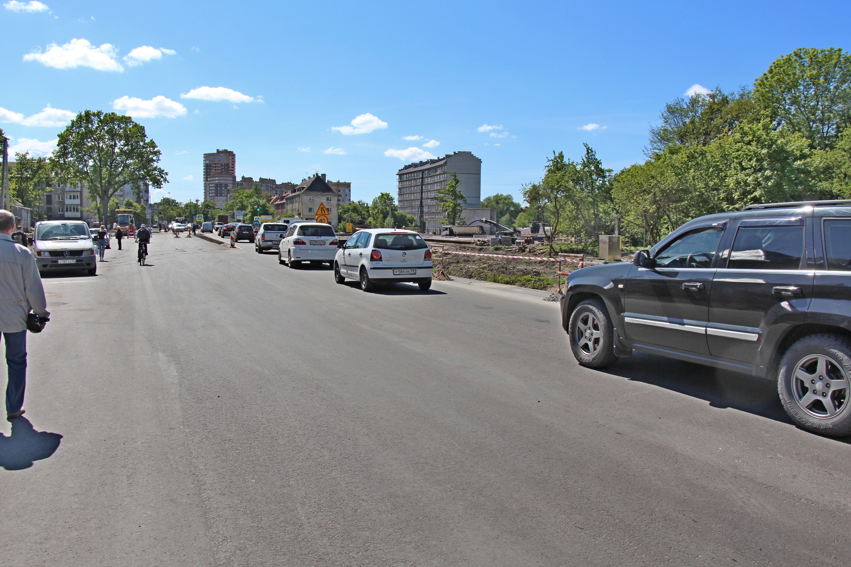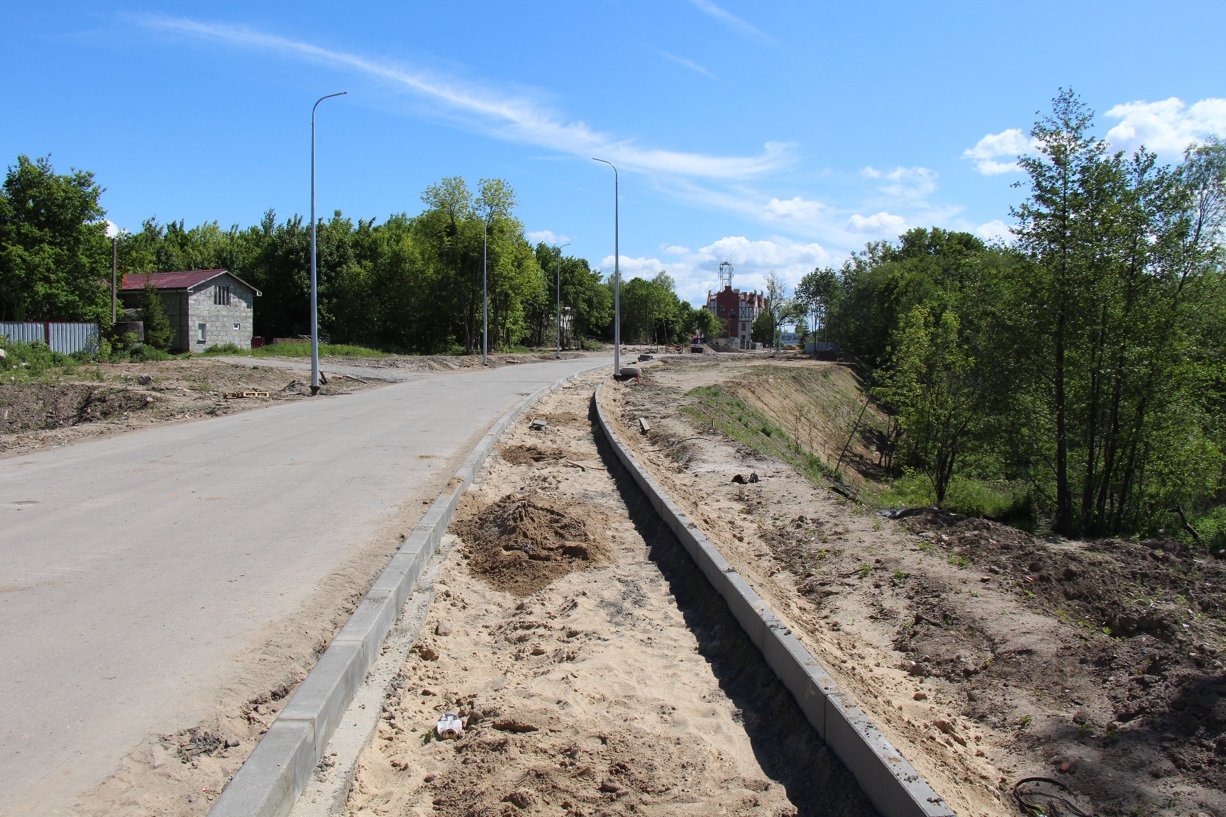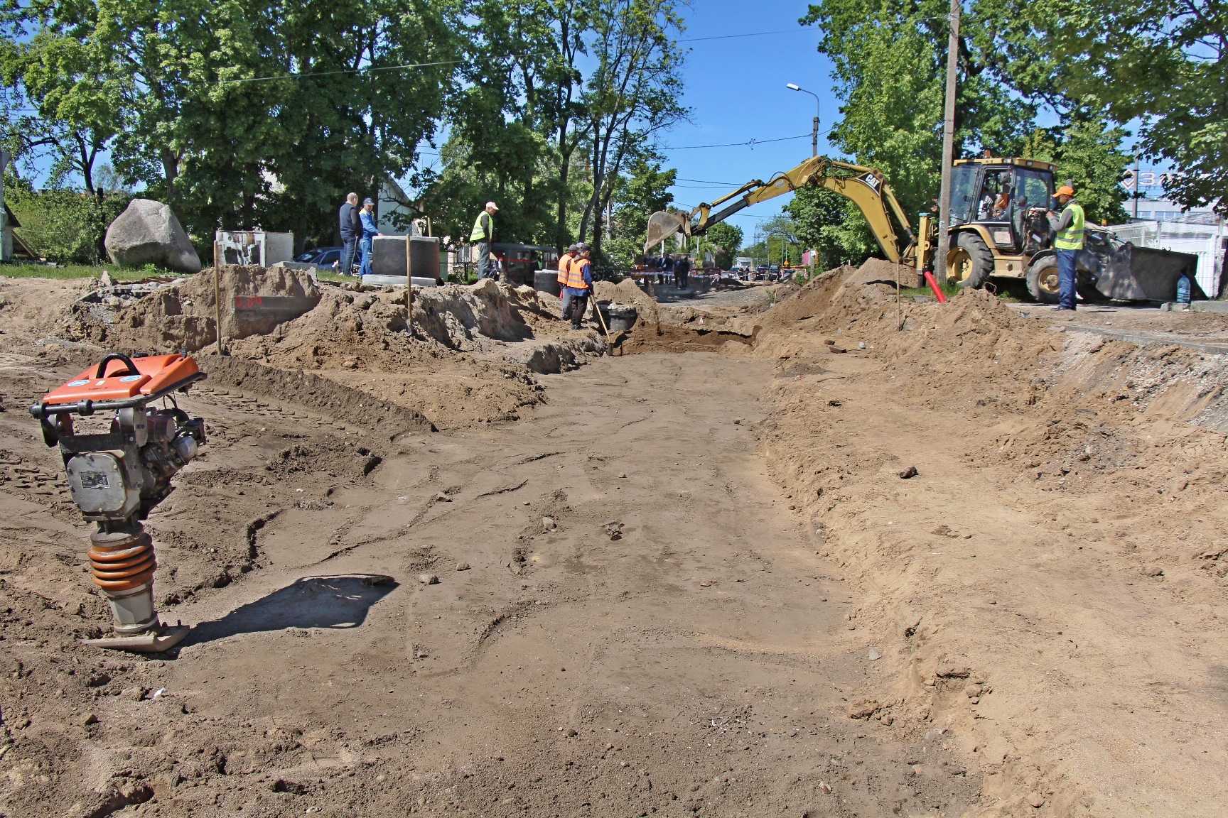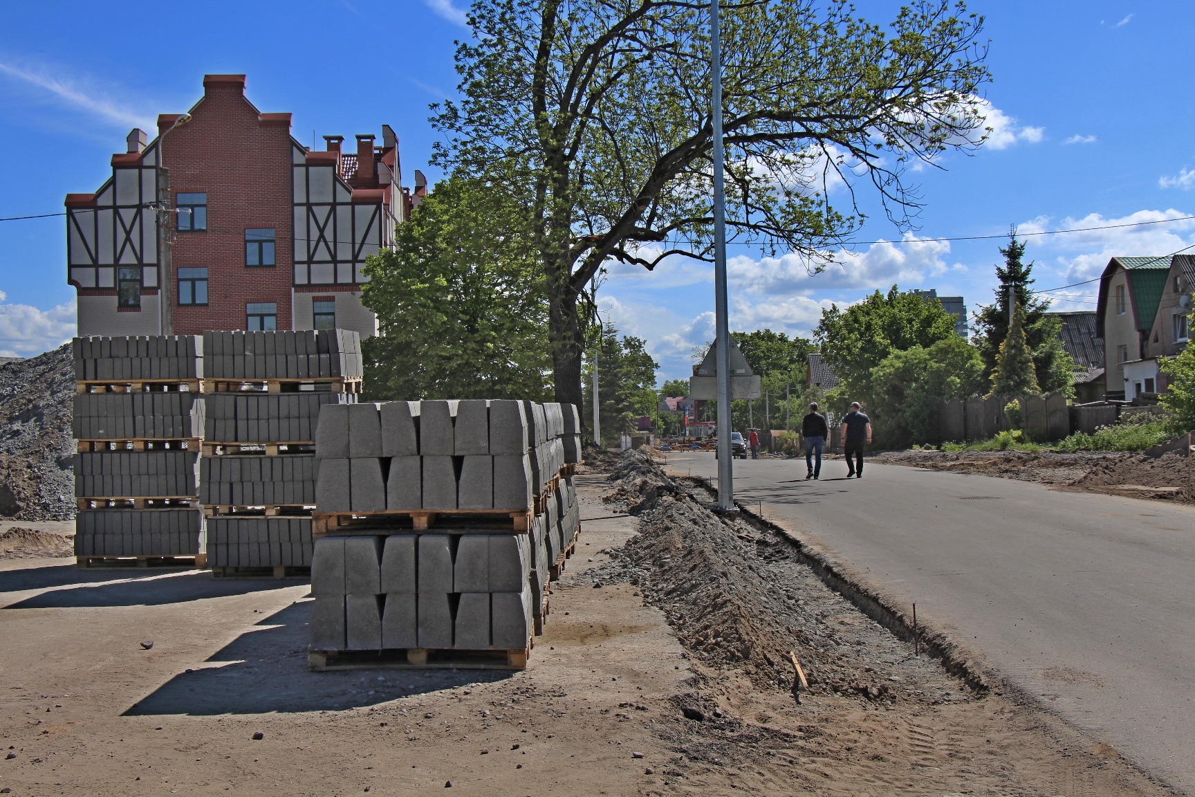 На противоположном конце улицы, со стороны Московского проспекта, снято старое асфальтовое покрытие и идёт подготовка к устройству основания этого участка дороги. От поворота к торговому центру до автостоянки уже уложен нижний слой асфальта, выставлен бортовой камень.