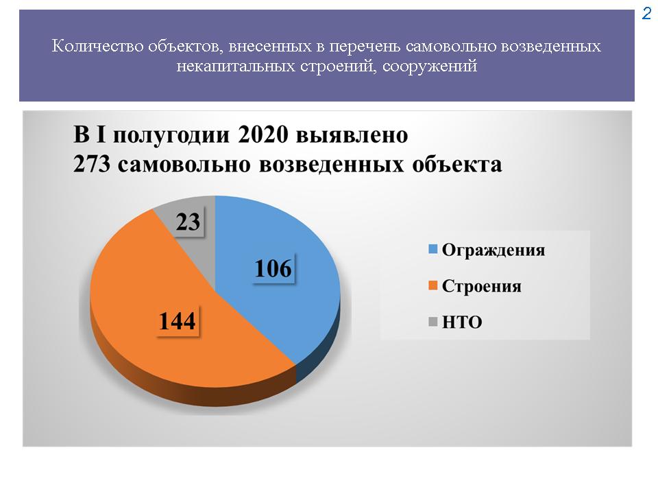 В Перечне самовольно возведенных некапитальных строений на начало года числилось 2781 объектов, по состоянию на 30.06.2020 — 2510 объектов, из которых в этом году выявлено 273, в том числе: 106 ограждений, 144 строений, 23 нестационарных торговых объектов (НТО).