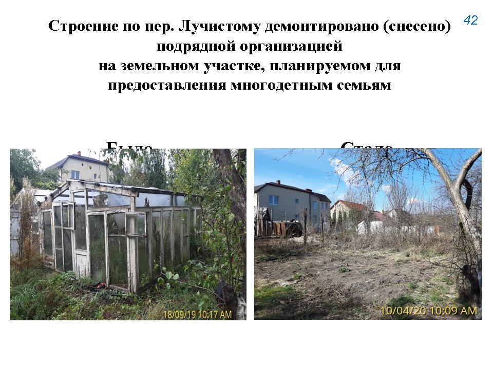 Комитетом был заключен муниципальный контракт на демонтаж (снос) самовольно возведенных объектов на сумму 763 000 руб. В настоящее время силами подрядной организации в рамках действующего муниципального контракта выполнены работы объёмом 258,22 куб. м на сумму 451 885 руб. По состоянию на конец июня демонтировано 72 объекта. Из них 25 объектов находились на земельных участках, планируемых для предоставления многодетным семьям (освобождено 9 земельных участков).