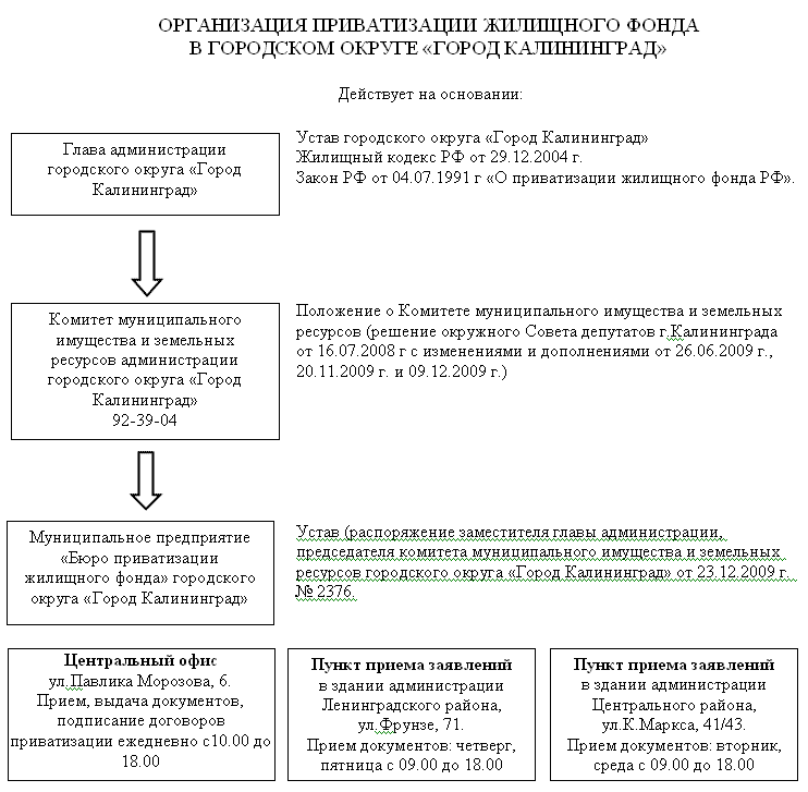 Однако, прием документов от граждан осуществляется во всех трех районах города. В настоящее время схема организации приватизации жилищного фонда в городском округе «Город Калининград» выглядит следующим образом: