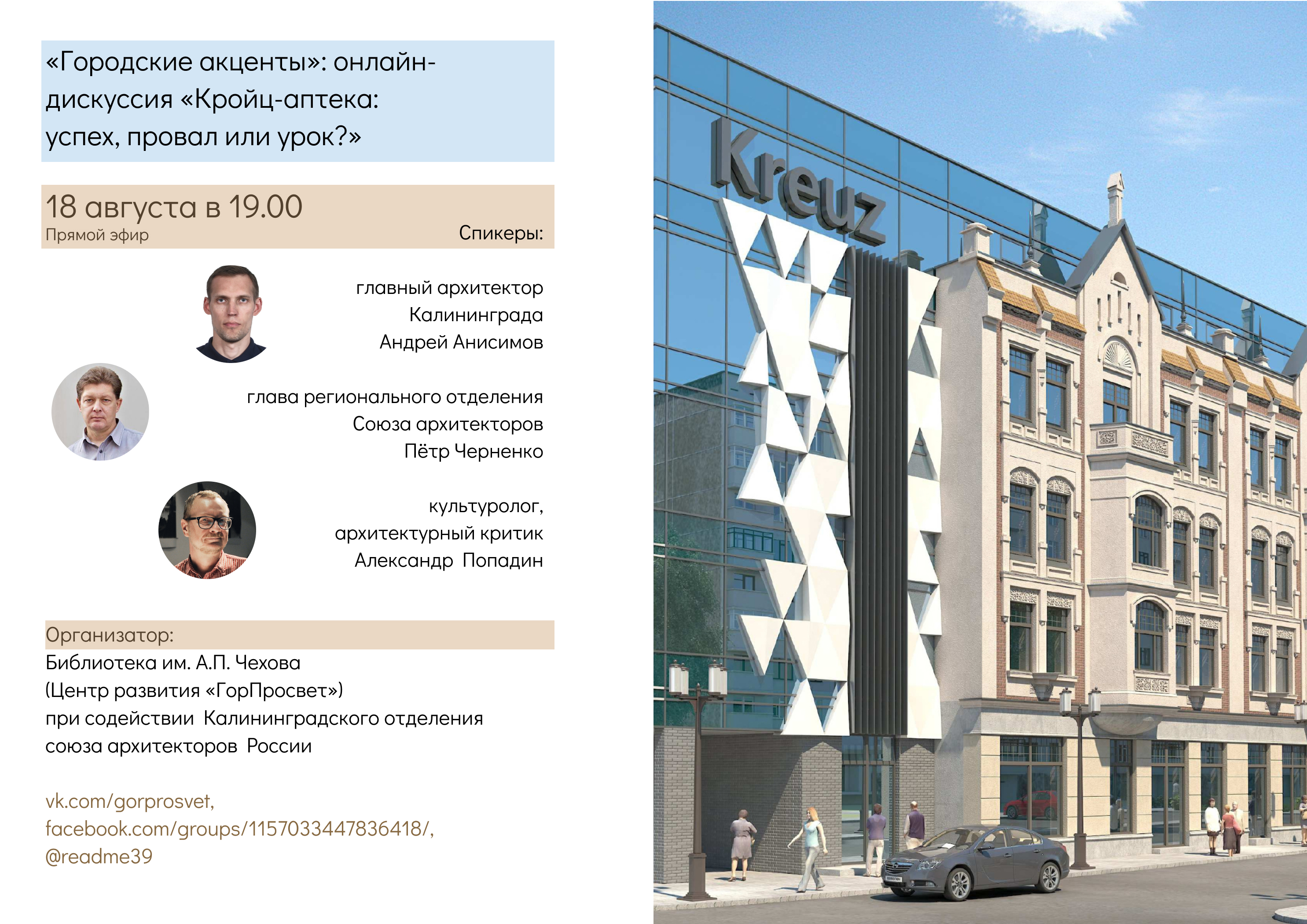 Центр городского развития «ГорПросвет» библиотеки им. А. П. Чехова приглашает присоединиться к очередной онлайн-встрече «Городские акценты». В этот раз разговор пойдет о Кройц-аптеке. Участники беседы смогут поставить точки и тире в самой нашумевшей в 2020 году истории реконструкции исторического здания Калининграда. Инициаторы дискуссии предлагают вспомнить, с чего всё начиналось, какие были предложены неофициальные конкурсные проекты реконструкции руин Кройц-аптеки, как проходило заседание градостроительного совета. В ходе онлайн-встречи есть возможность понять, что получилось в результате и почему история получила такой общественный резонанс как в городе, так и в области.