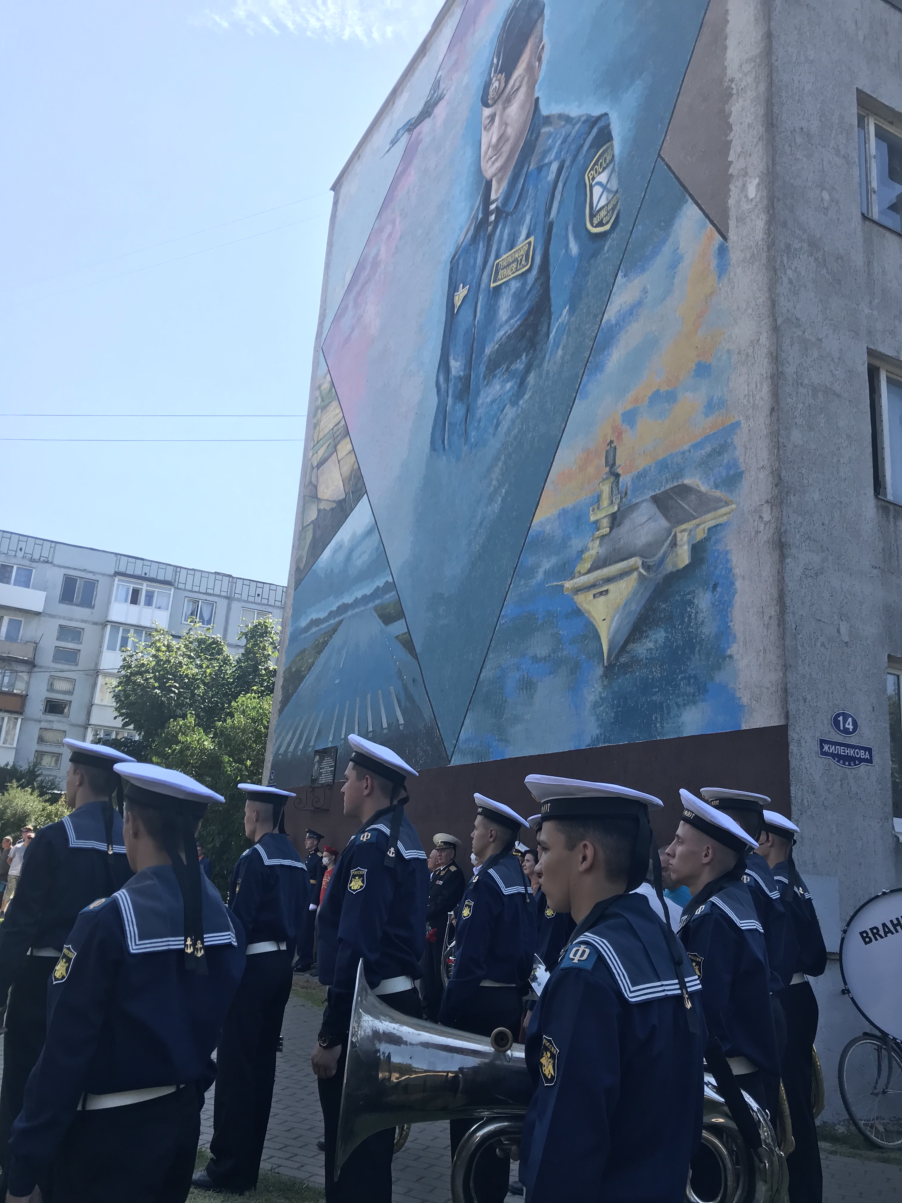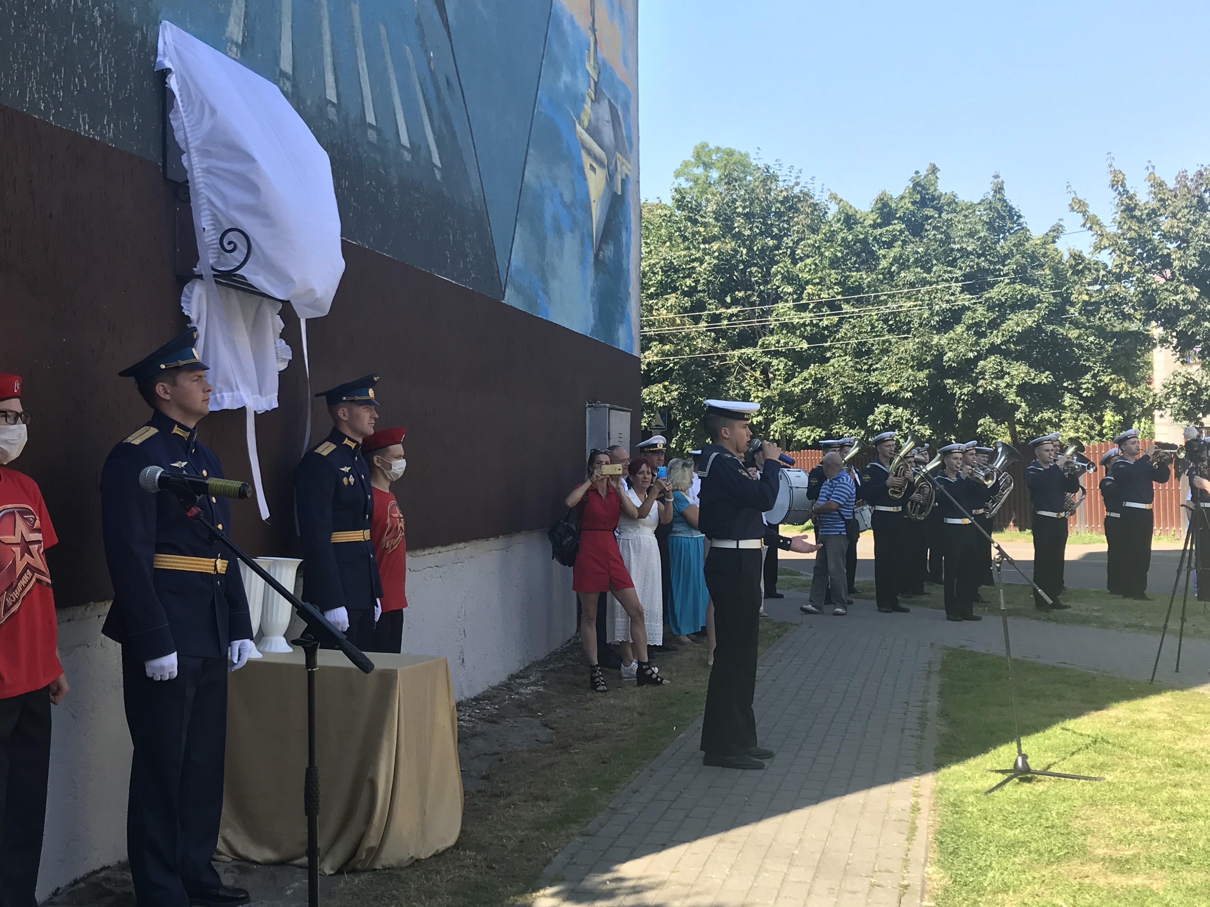 Под музыку оркестра авиации Балтийского Флота состоялось торжественное открытие мемориальной доски и портрета героя. Почетное право открытия предоставили молодому поколению - лётному составу 689 гвардейского Сандомирского ордена Александра Невского истребительного авиационного полка имени трижды Героя Советского Союза Александра Ивановича Покрышкина.
