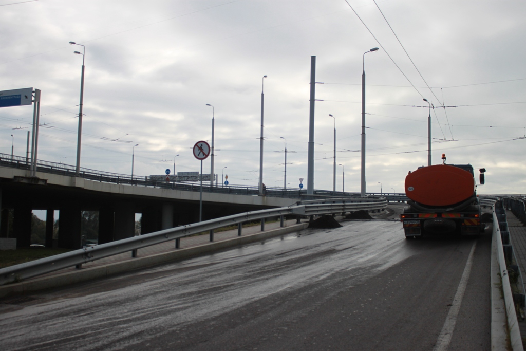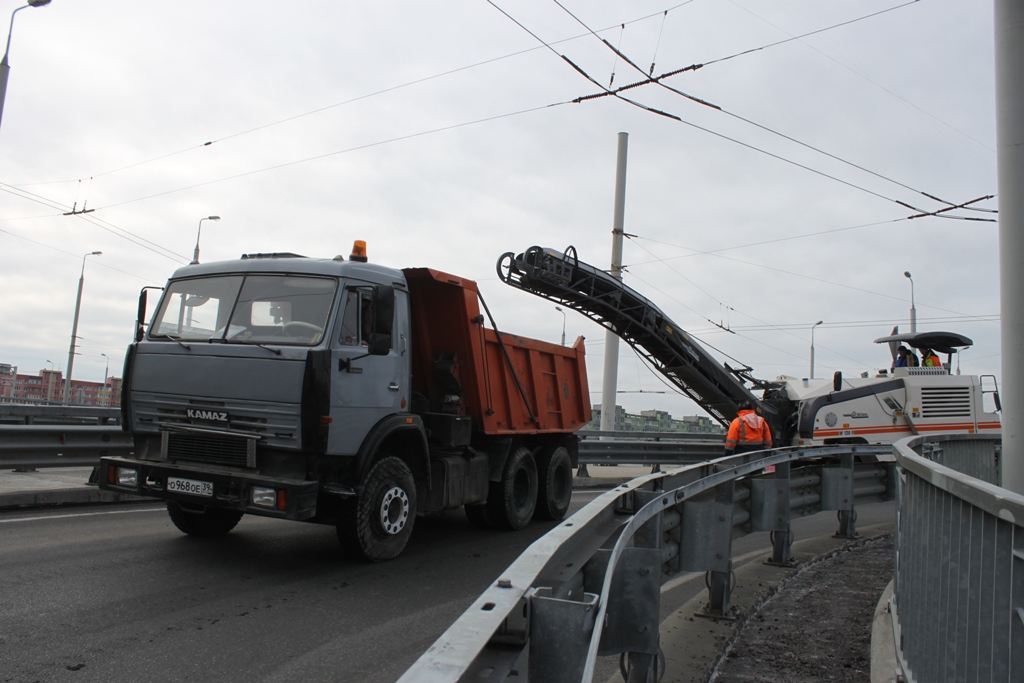 Сейчас на объекте ведутся работы по устранению дефектов эксплуатационного характера: производится демонтаж изношенного покрытия асфальта на съездах, разгонной части и путепроводе через Московский проспект, транспортной развязки на улице Дзержинского, на мосту через реку Старая Преголя, завершаются работы по окраске пешеходного ограждения.