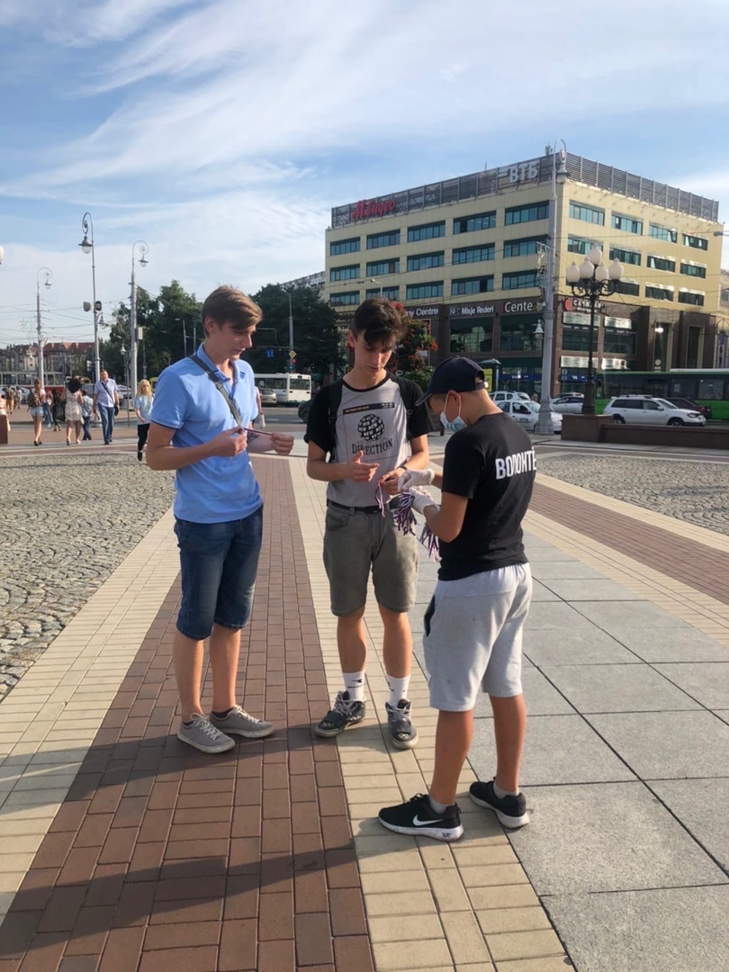 В рамках акции «Триколор» на площади Победы волонтёры МЦ «Доброволец» раздавали ленточки с цветами российского флага жителям города.