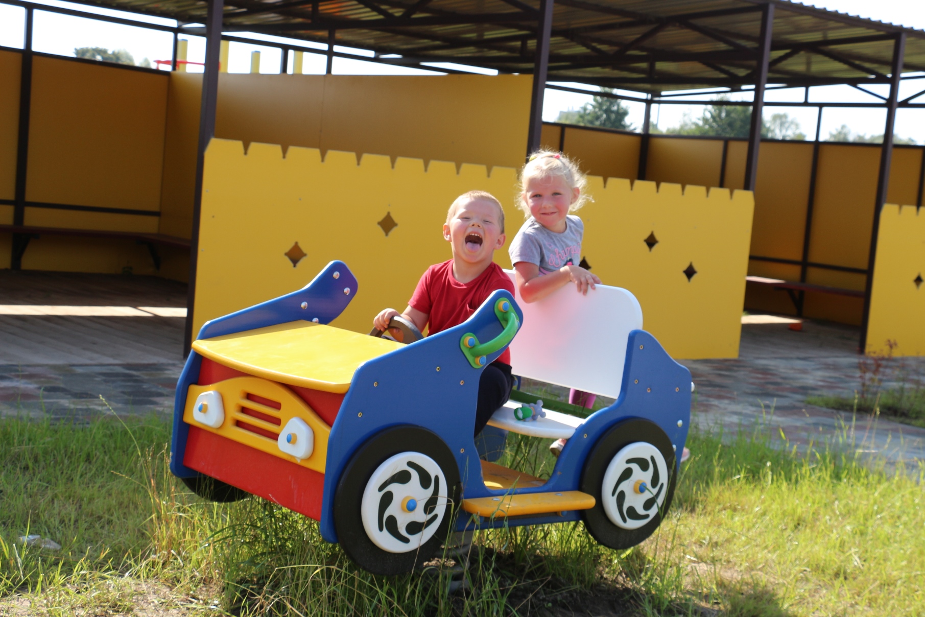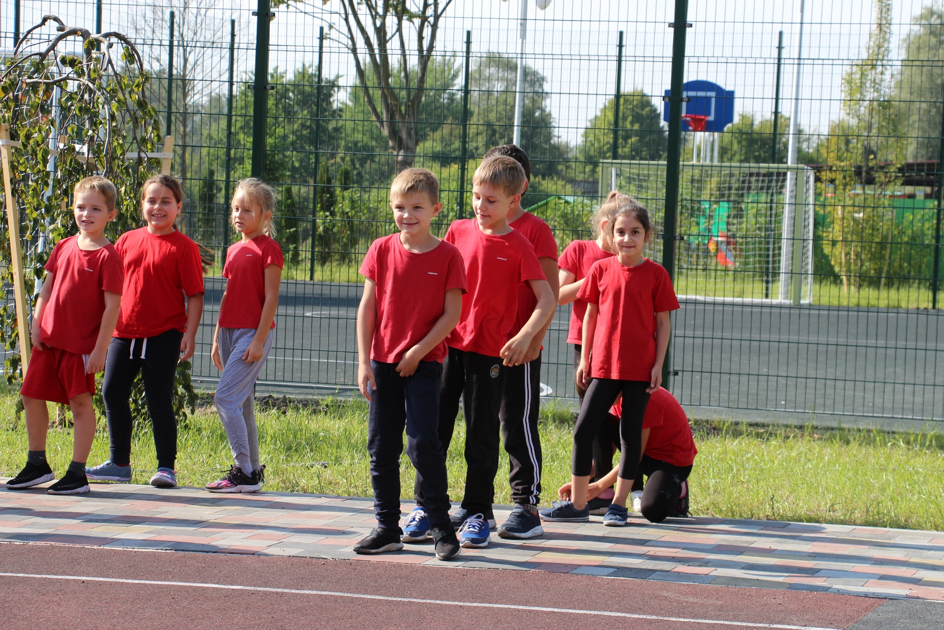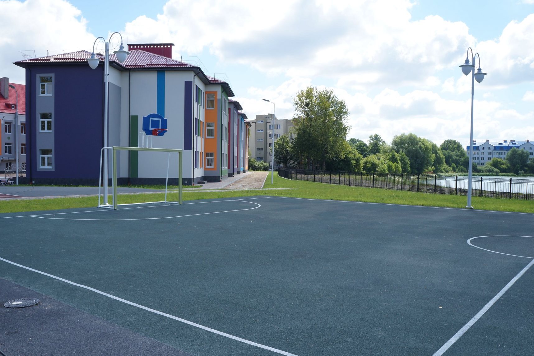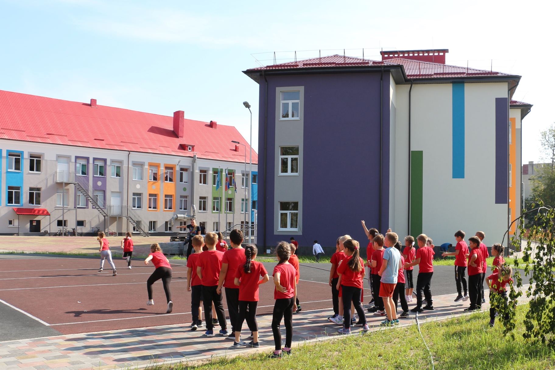 На прилегающей территории обустроены: детские игровые площадки и теневые навесы, универсальная спортивная площадка для занятий волейболом, минифутболом, баскетболом. Покрытие групповых площадок и площадок для занятий физкультурой предусмотрено травмобезопасным. Рядом с новым зданием создана учебно-опытная площадка для школьников, на которой они могут заниматься выращиванием различных сельскохозяйственных культур. Созданы благоприятные условия для детей и работающих в здании детского сада-школы сотрудников, проведено озеленение территории, оборудованы площадки для отдыха.