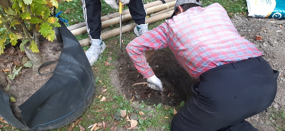 19 саженцев дубов, каштанов, лип и ели переехали из питомника и обрели сегодня новую прописку на ул. Памяти Павших в Афганистане. Все они неплохого качества, возраст молодых деревьев 12-14 лет.