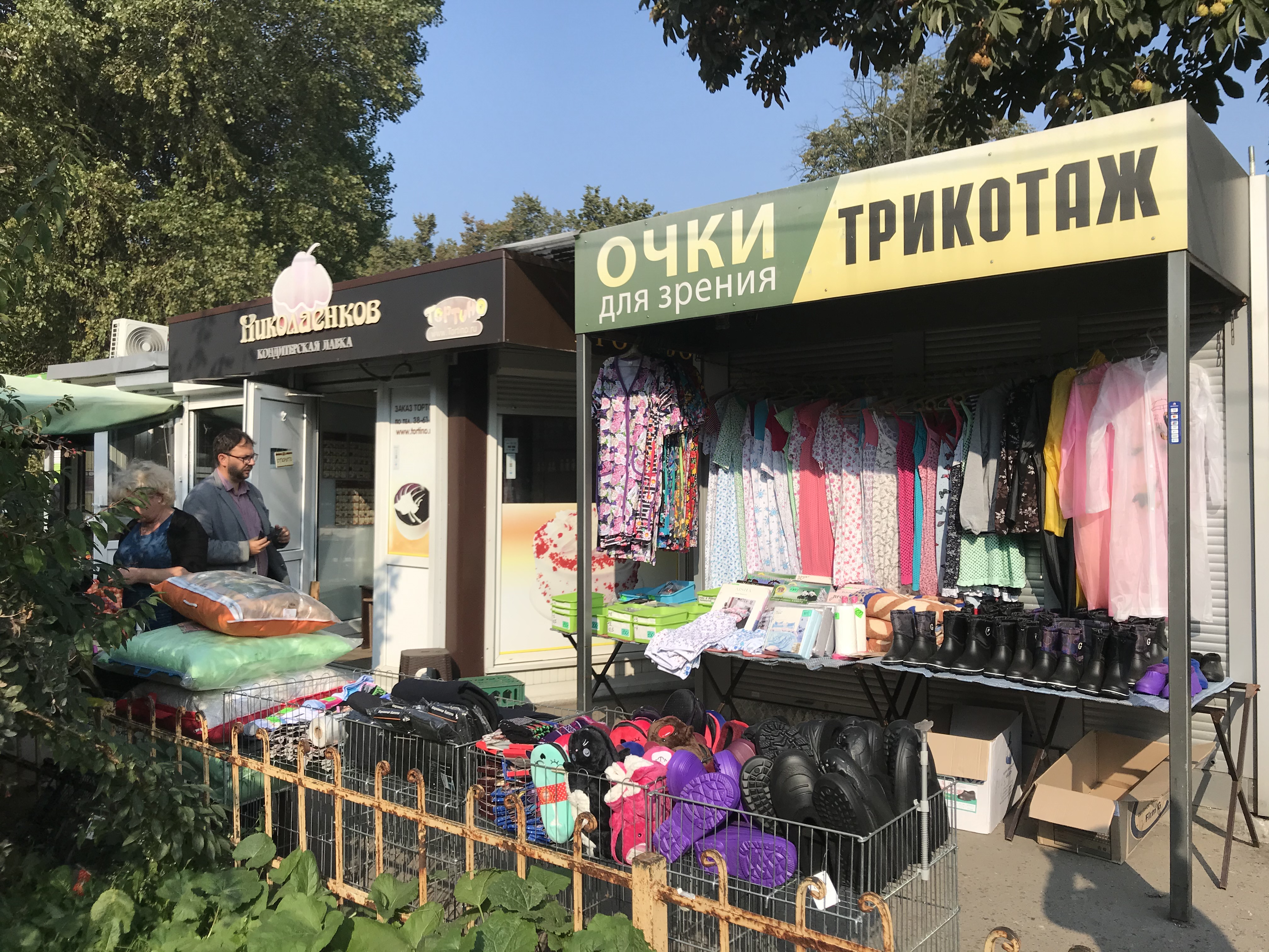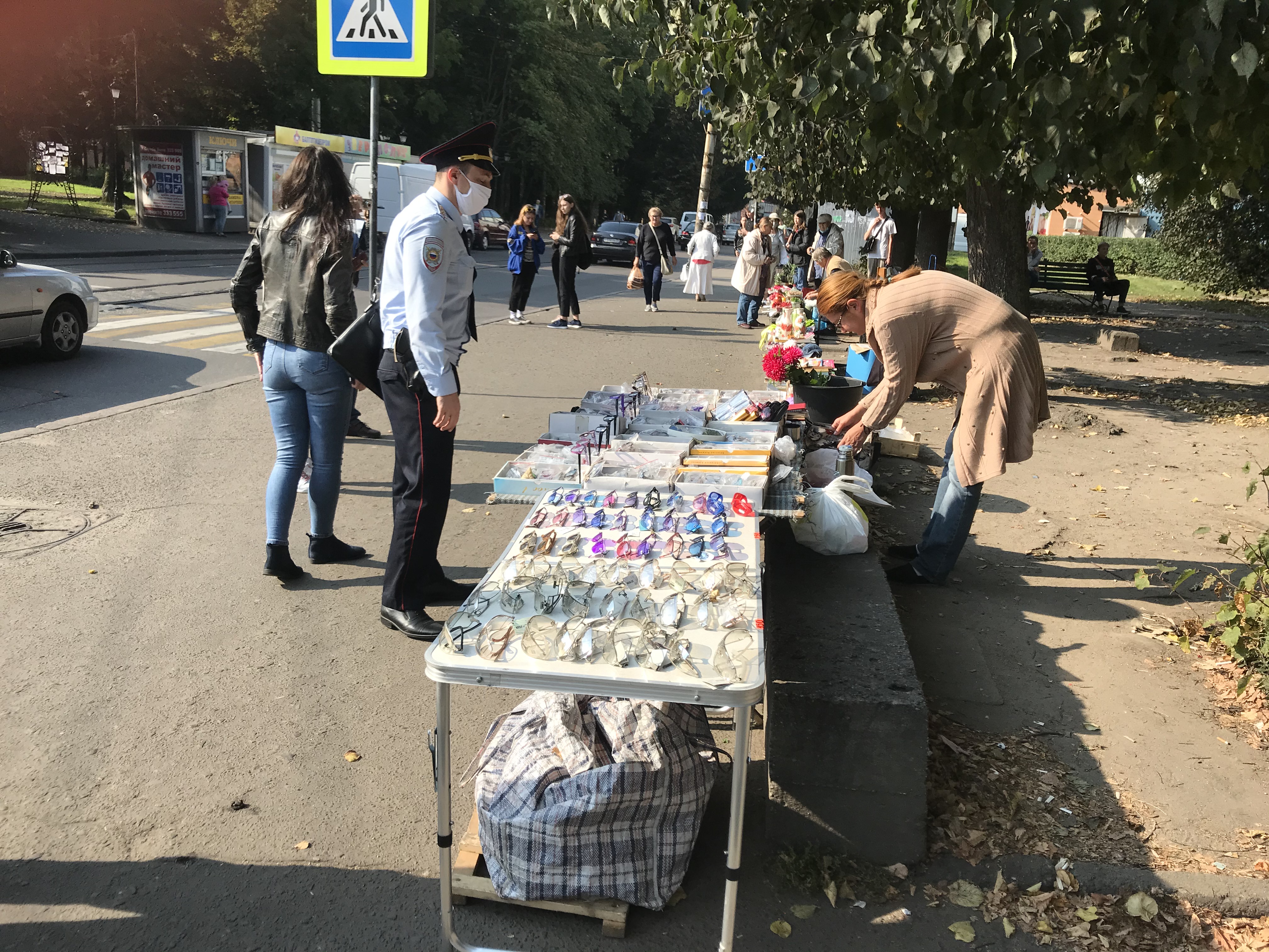 По другую сторону входа в рынок пешеходный тротуар завален столами с трикотажными изделиями. Сотрудники комитета проверяют документы, есть разрешение на торговлю в павильоне. На тротуарах торговля незаконная. Продавец устраняет нарушение. С ней проведена разъяснительная работа. Участники рейда переезжают к кинотеатру. На тротуаре расположилась самодельная торговая точка. На столах разложены очки. Сотрудники составляют протокол. В ходе рейда всего за час с небольшим составлено три протокола.