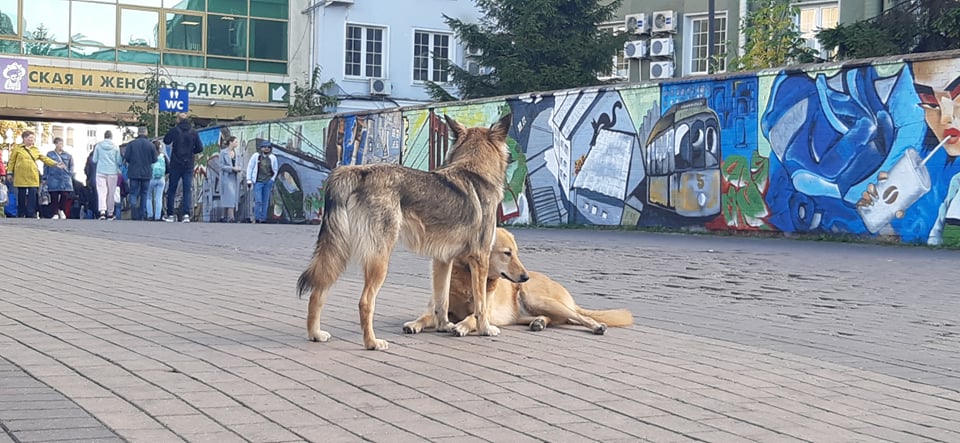 «Коронованная» собака - намёк на бездомных собак, многие годы как облюбовавших прилегающую к Северному вокзалу территорию, прикормленные предпринимательницей по соседству. Большинство из них уже обрело свои дома, а остальные всё ещё ищут новых хозяев.