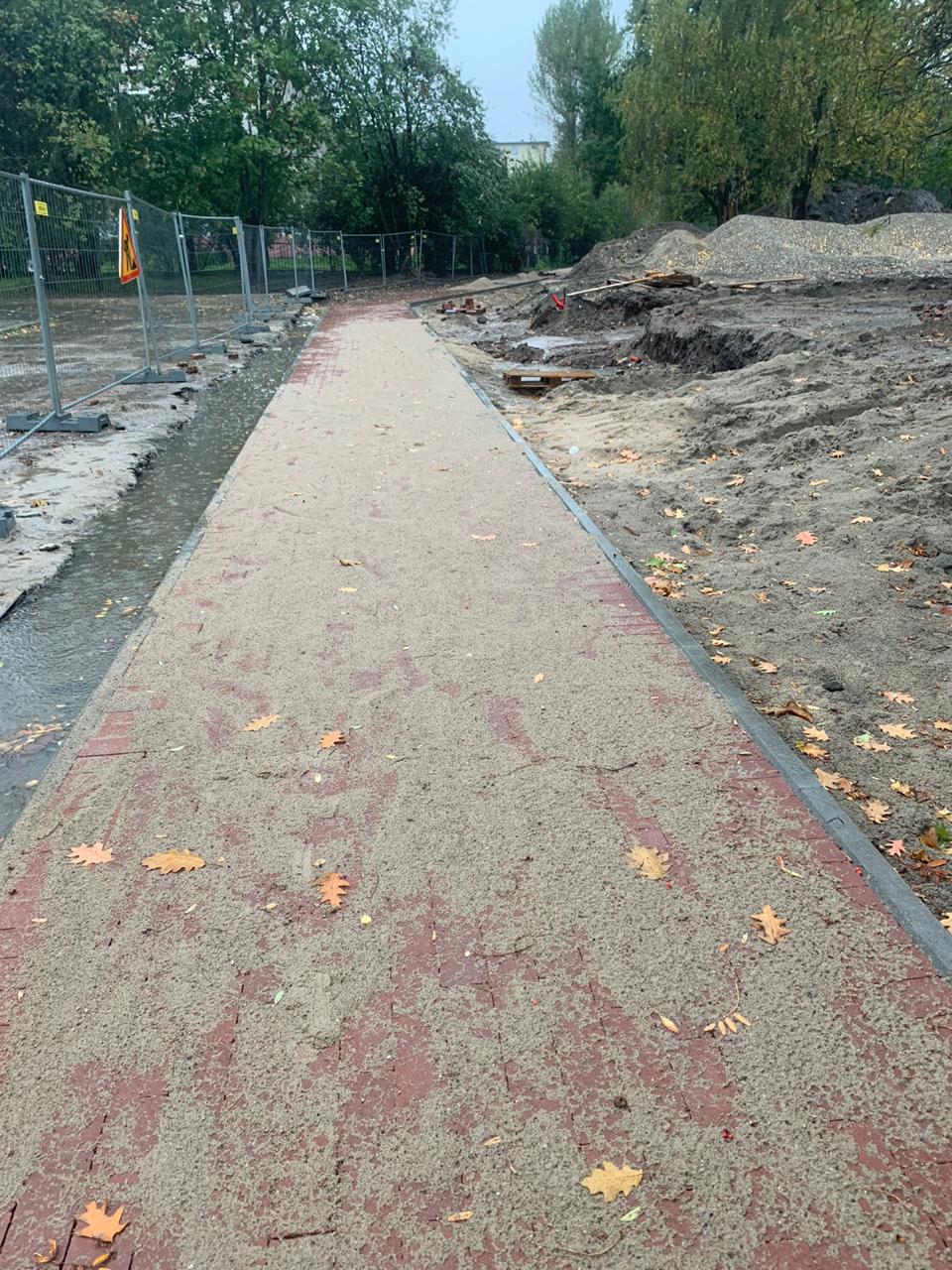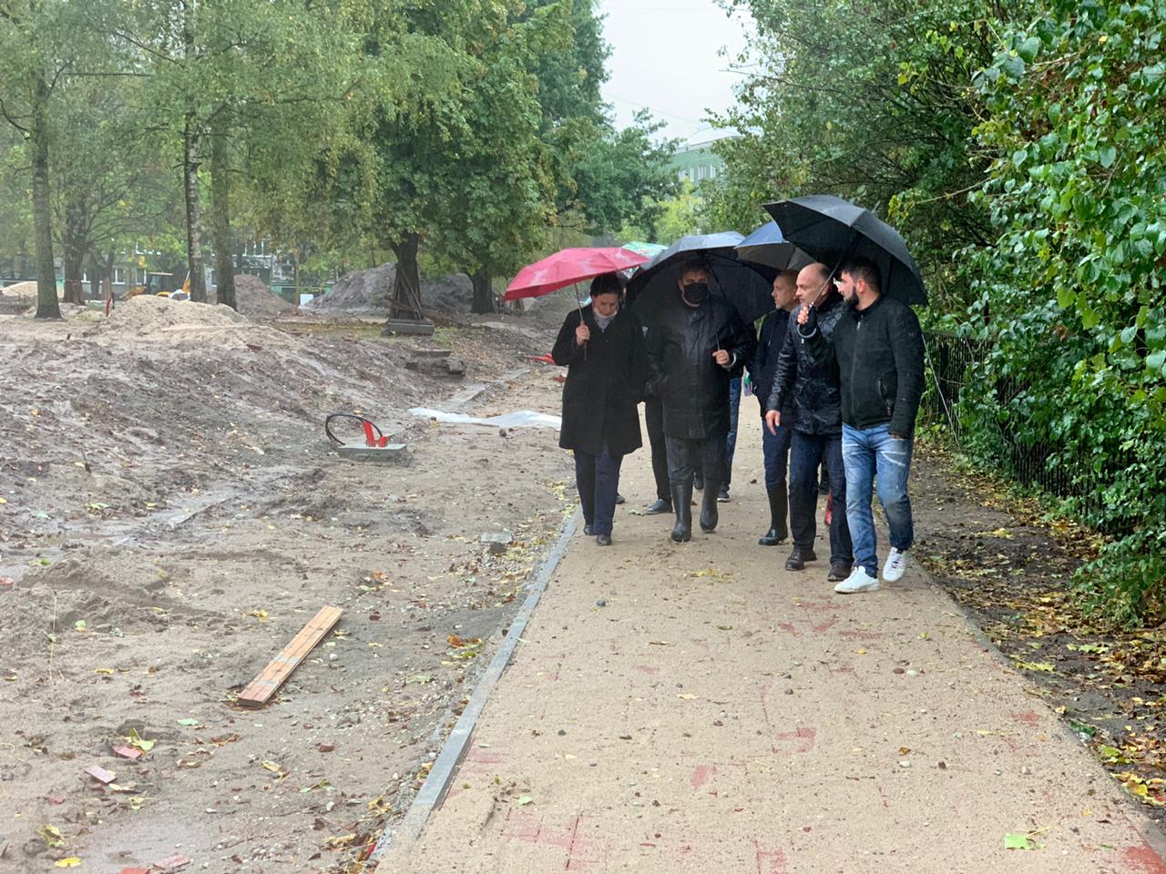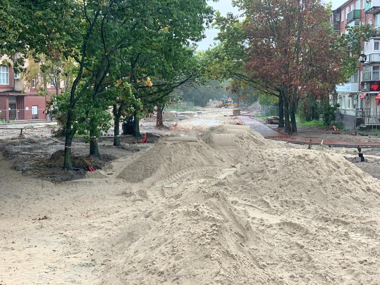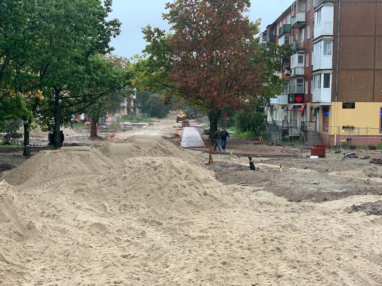 На сегодняшний день здесь выполнено обустройство коммуникаций для освещения и системы «Безопасный город», спланирована территория, уложен песчаный настил под дорожки, на девяносто процентов готова велодорожка, выполнено устройство бетонных оснований под детские площадки, бетонных несущих конструкций пандуса, подпорной стены со стороны улицы Черняховского, установлен фундамент под опоры освещения.