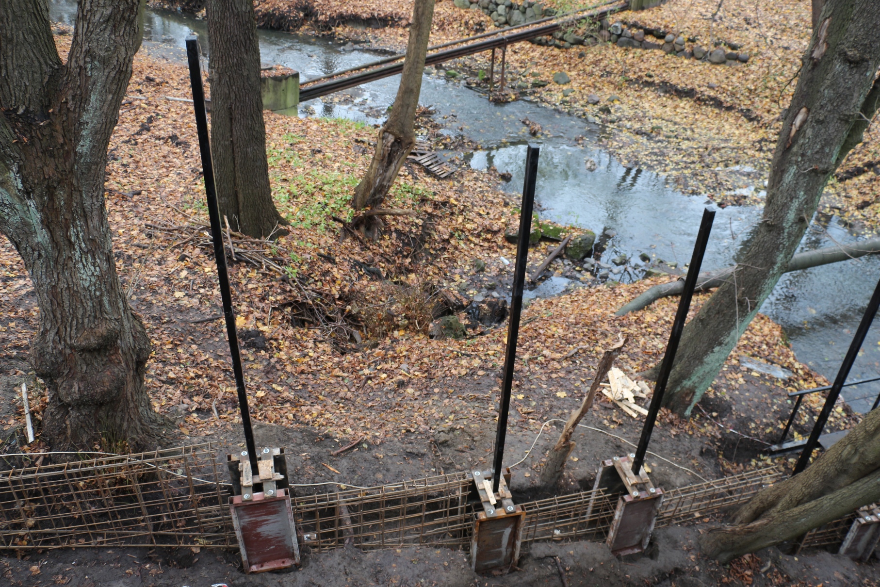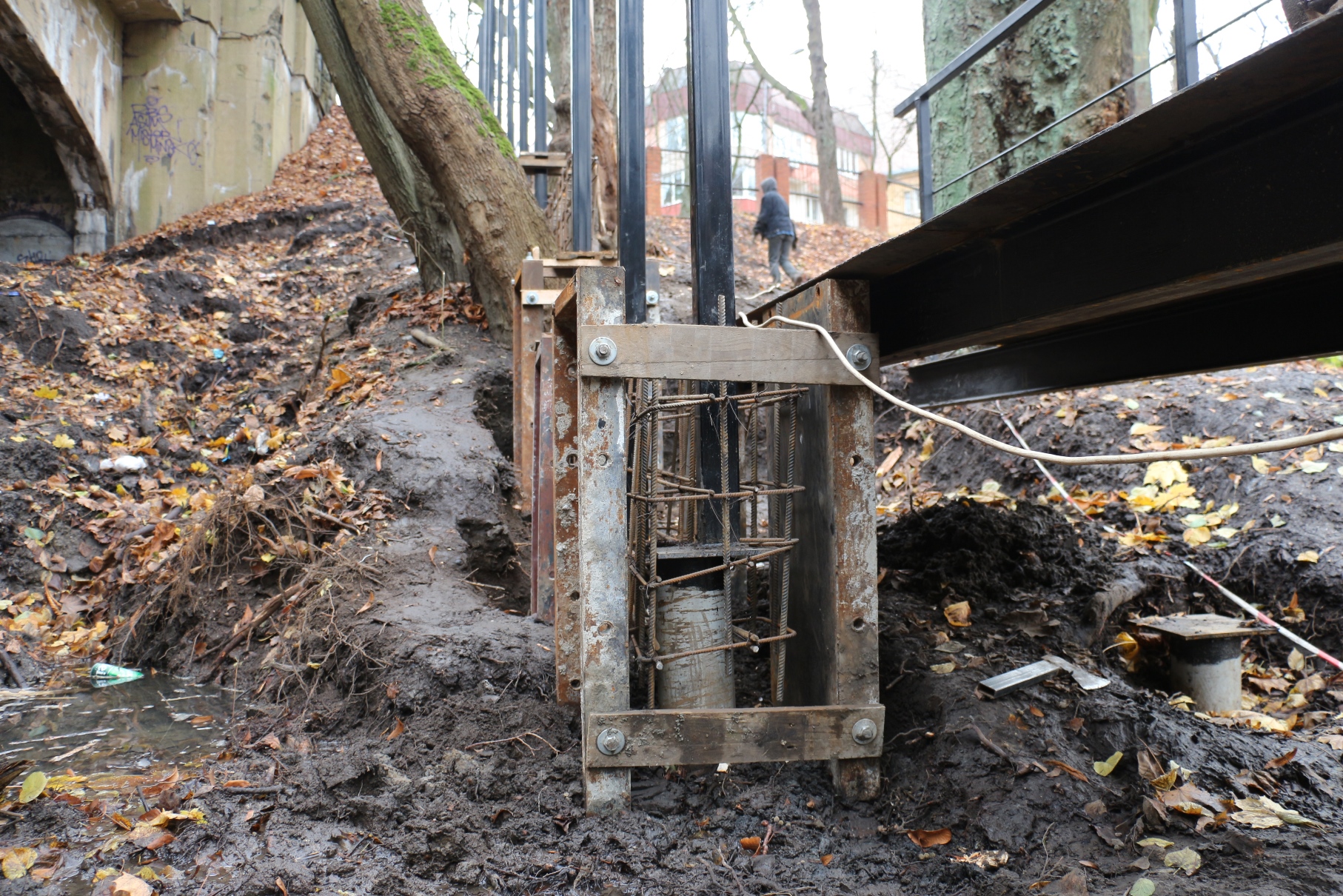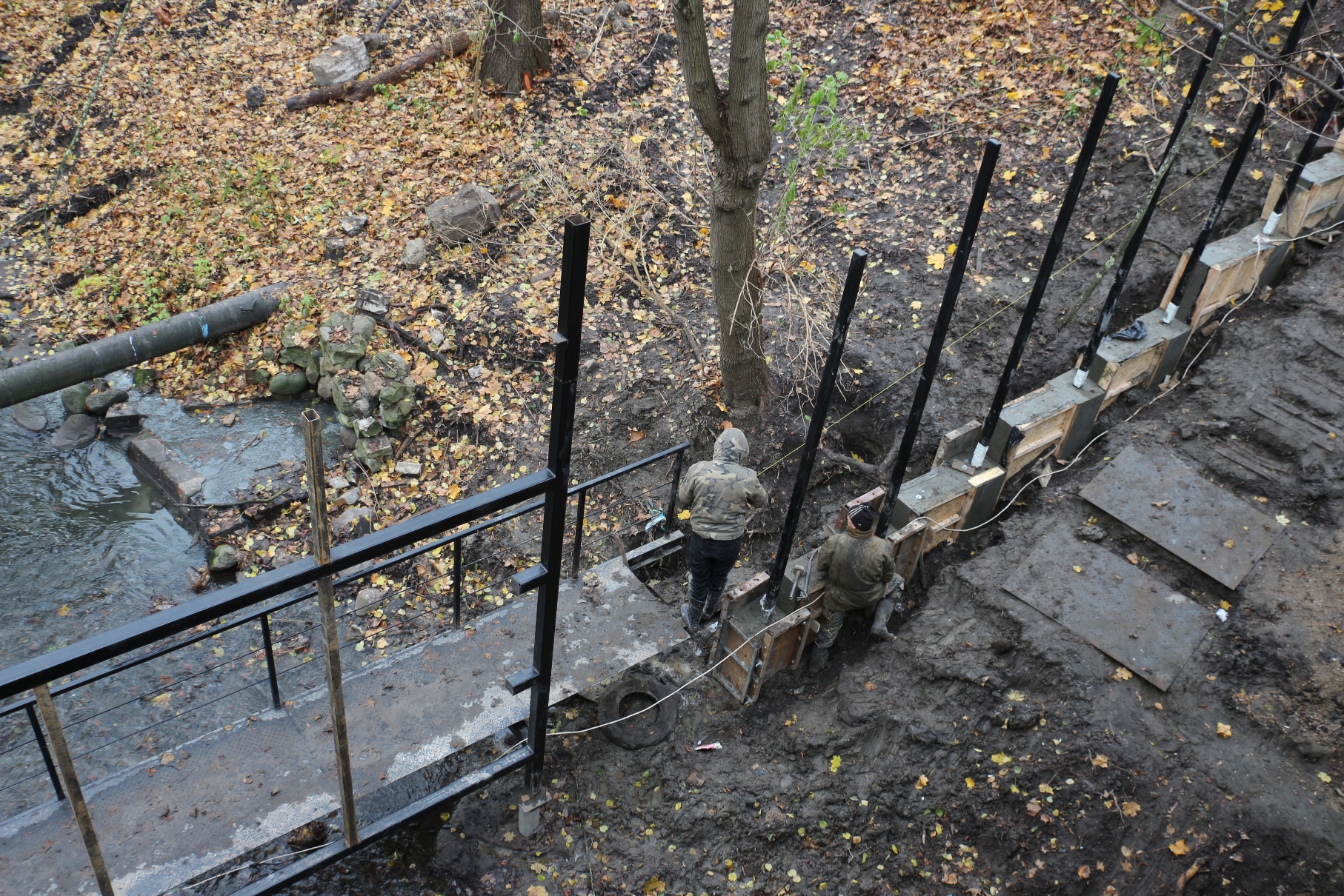 Прежде, чем приступить к созданию нового ограждения, подрядчику было необходимо произвести демонтаж старого, выкорчевать деревья, вросшие корнями в его фундаменты. Также по этой территории проходят инженерные коммуникации (газ, теплотрасса, различные кабели), и строителям приходится работать в весьма стесненных условиях. Кроме того, на склоне ручья непростые, слабые грунты, которые надо учитывать.