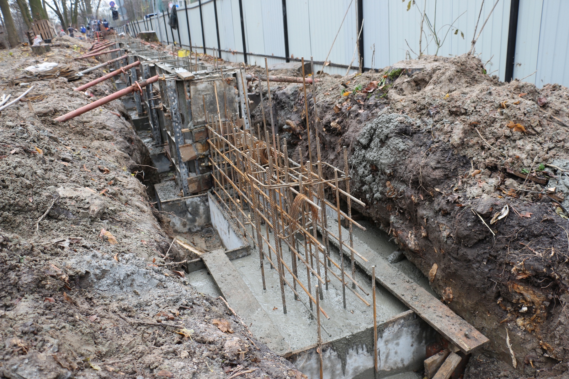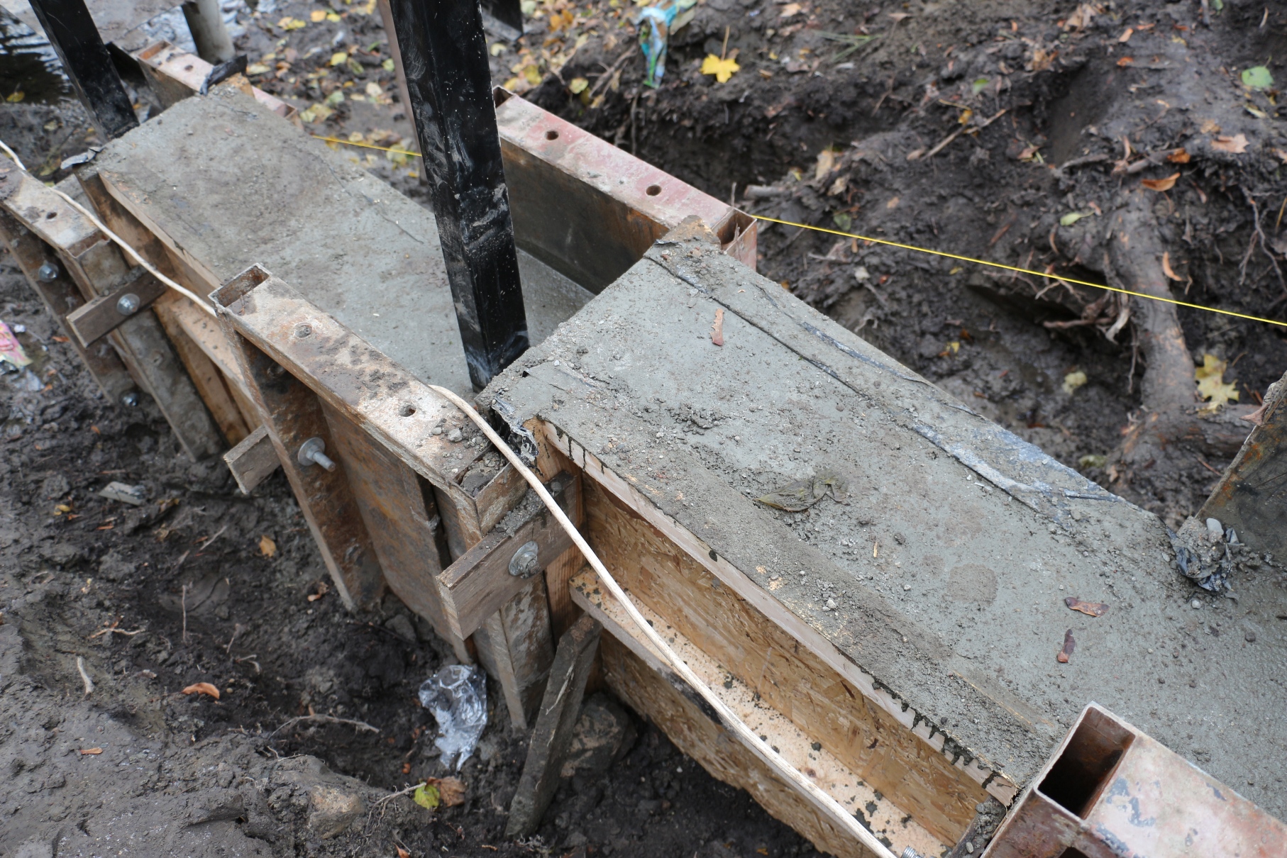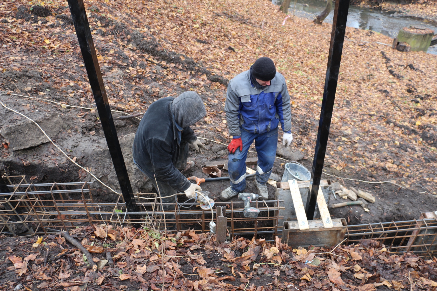 Прежде, чем приступить к созданию нового ограждения, подрядчику было необходимо произвести демонтаж старого, выкорчевать деревья, вросшие корнями в его фундаменты. Также по этой территории проходят инженерные коммуникации (газ, теплотрасса, различные кабели), и строителям приходится работать в весьма стесненных условиях. Кроме того, на склоне ручья непростые, слабые грунты, которые надо учитывать.