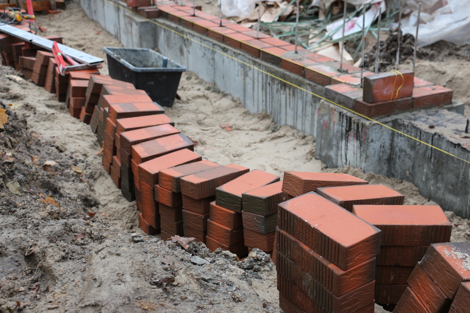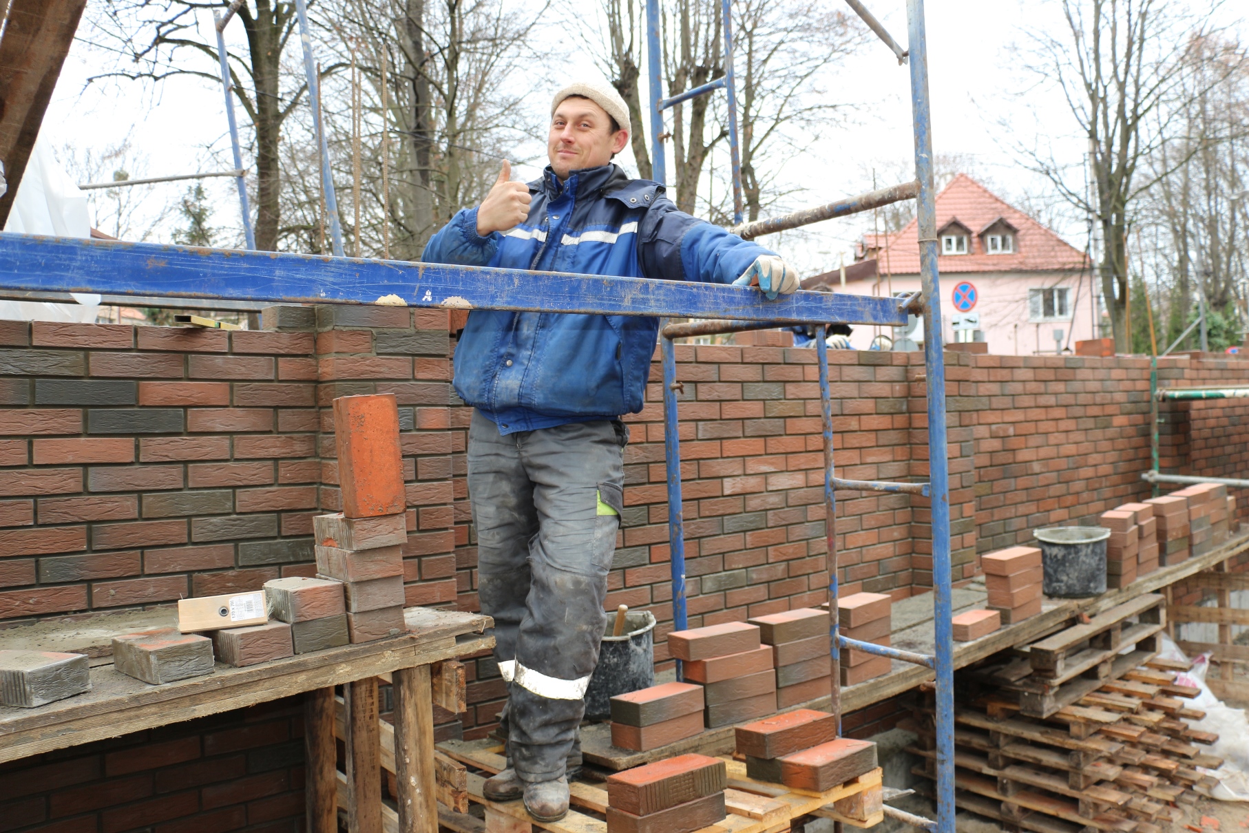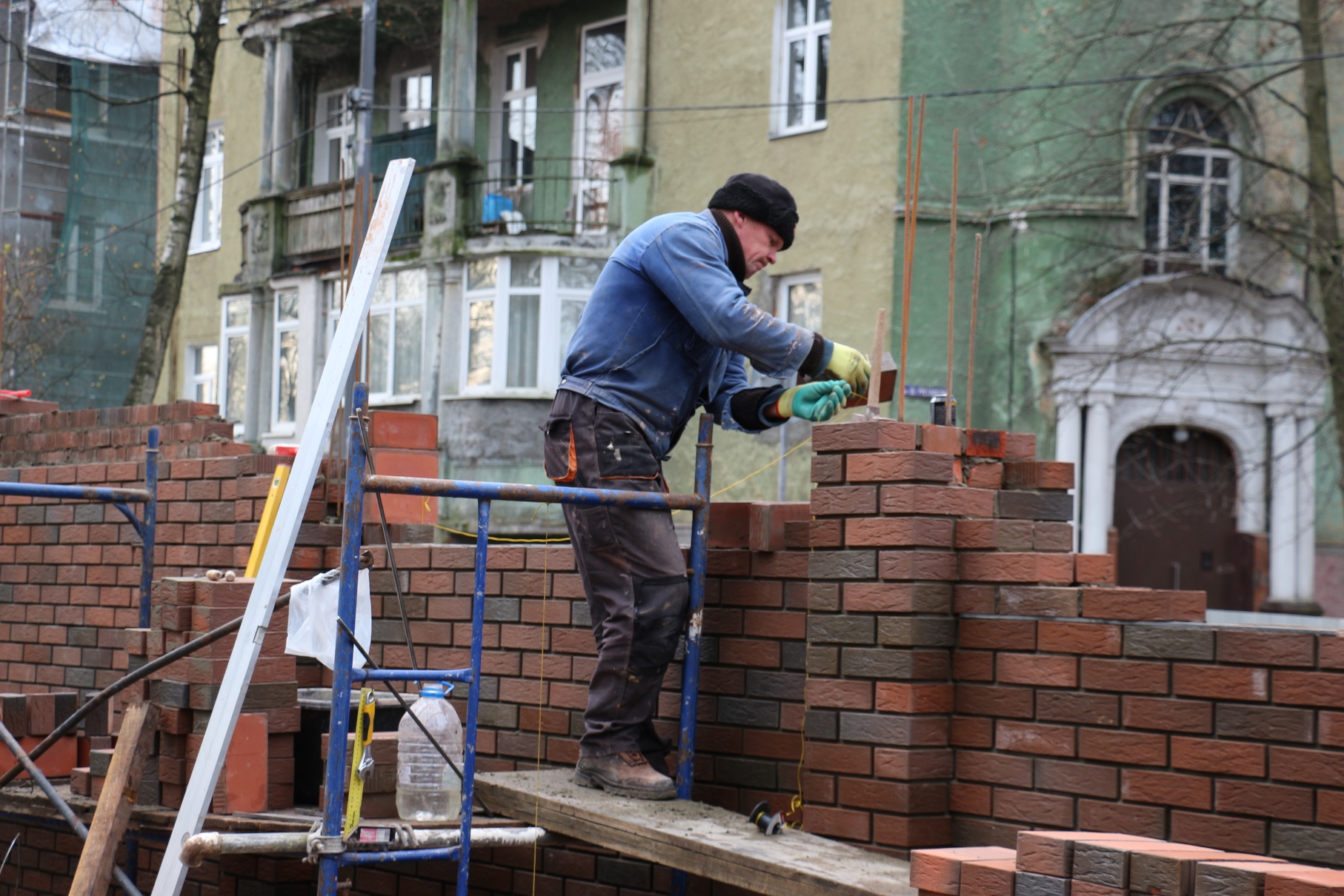Кладка керамического кирпича ведется под расшивку. Это непростое дело, требуются мастерство и определенные навыки, чтобы лицевой шов получился ровным и красивым. А каменщиков, владеющих этим мастерством, в Калининграде единицы. Удалось их найти и привлечь для выполнения столь тонкой работы.