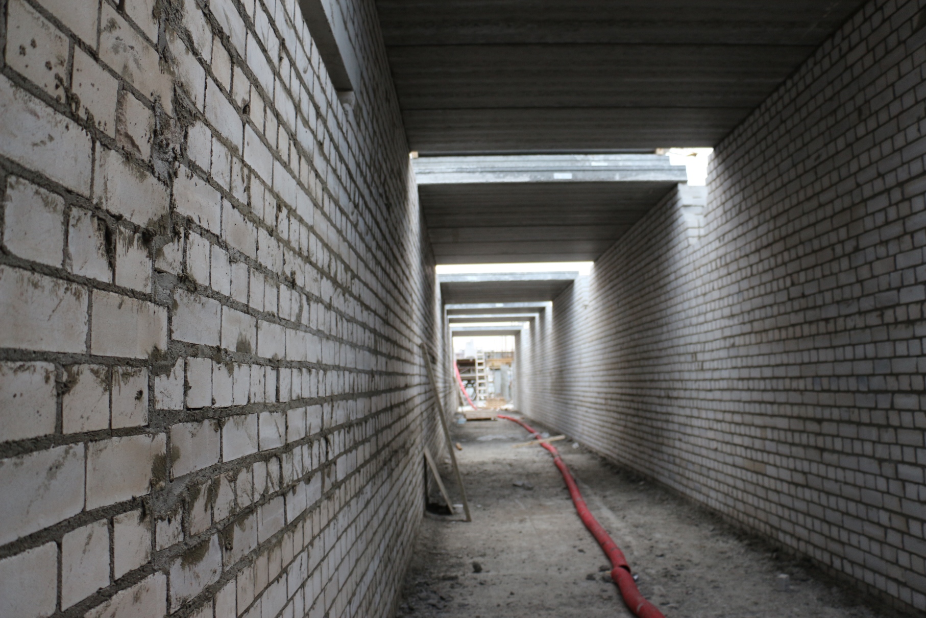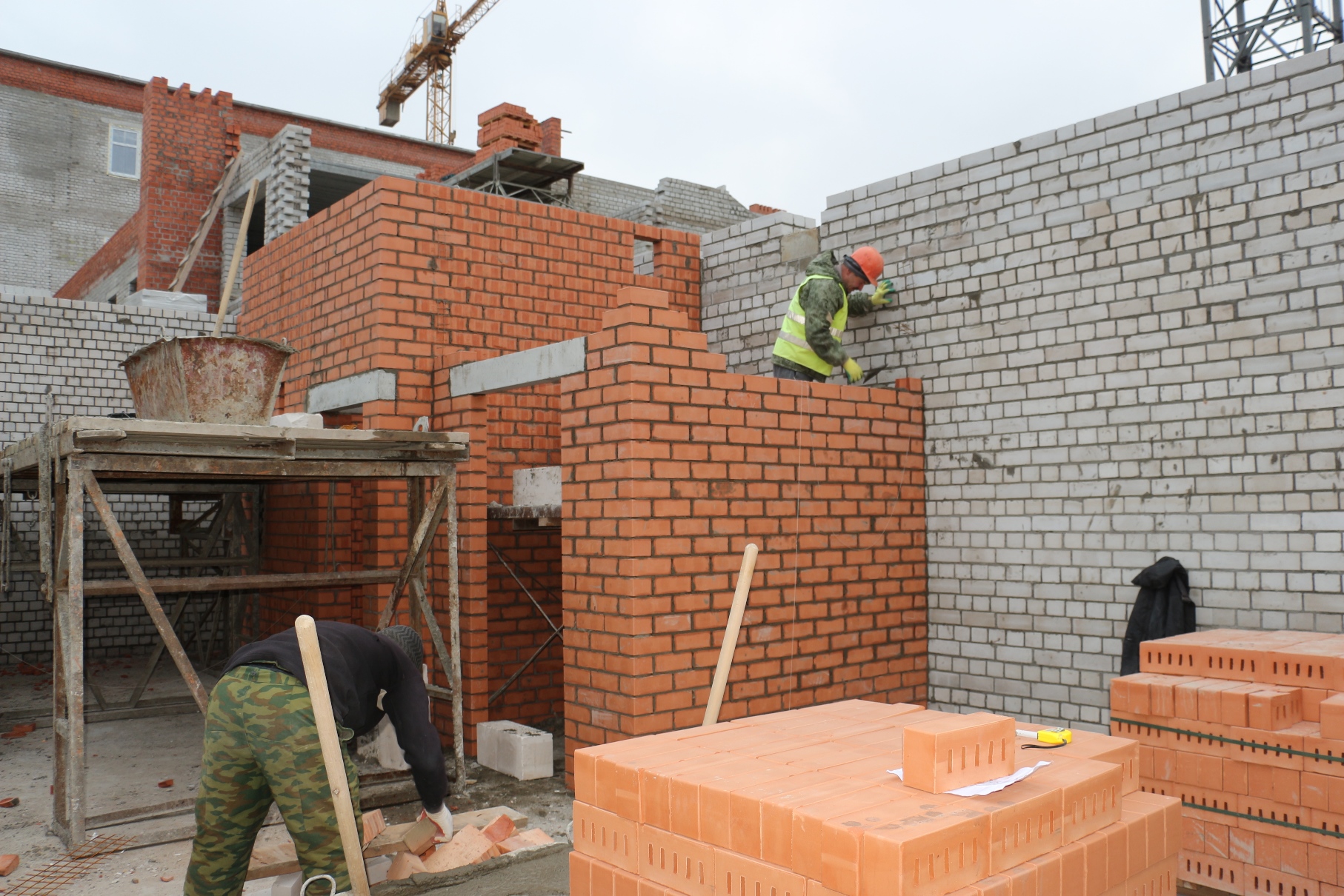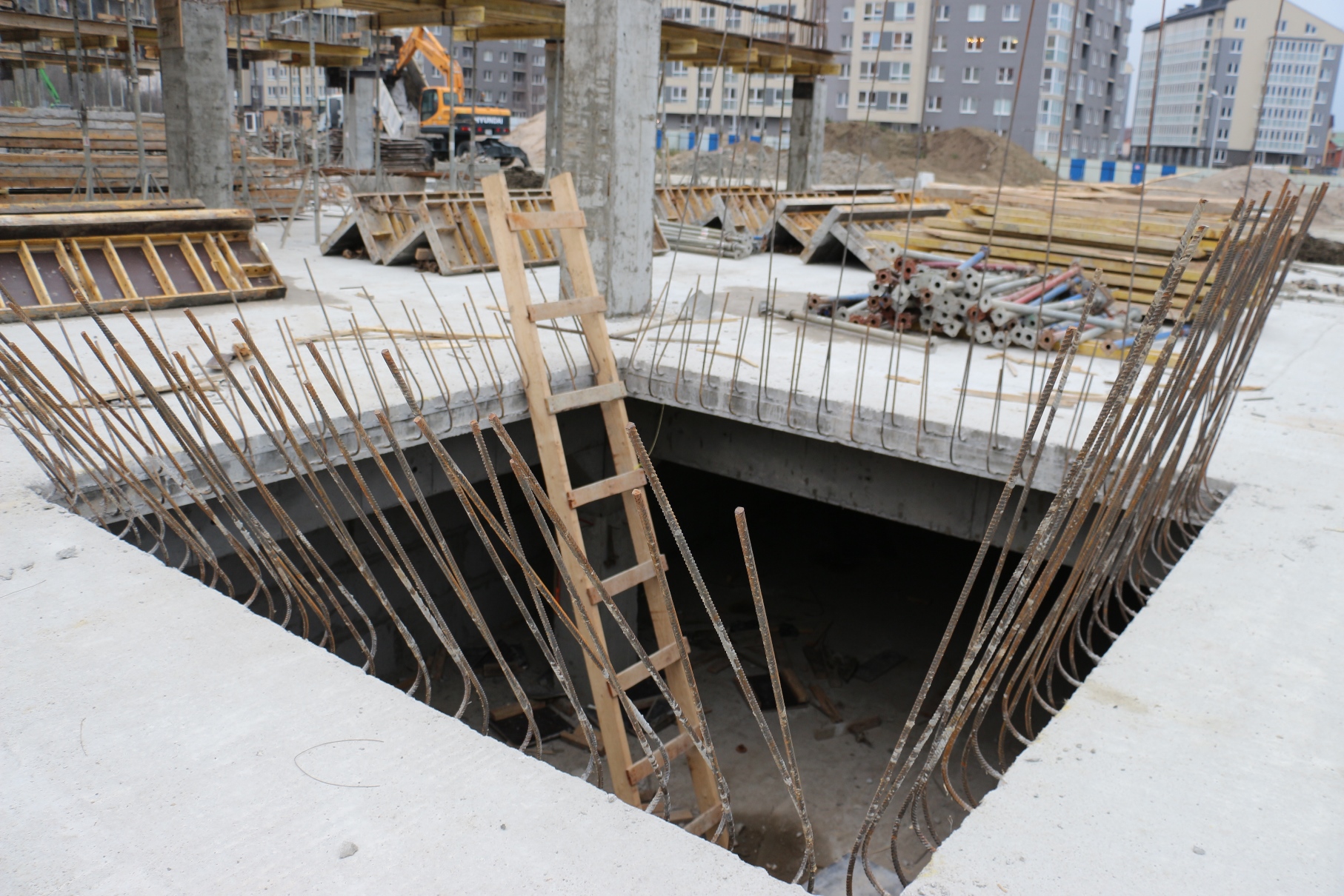 Генеральный подрядчик ООО СЗ «АК-СТРОЙ» приступил к работам на стройплощадке в апреле этого года. В ноябре у него были небольшие трудности на 1-м блоке, где у противорадиационного перекрытия достаточно сложная плита, армирование требовали большего приложения сил и времени. Сейчас плиту перекрытия между помещением противорадиационного укрытия (ПРУ) и верхней функциональной частью первого блока уже полностью залили. Сверху над укрытием будет располагаться пищеблок и обеденный зал, и здесь теперь тоже работы ведутся хорошими темпами.