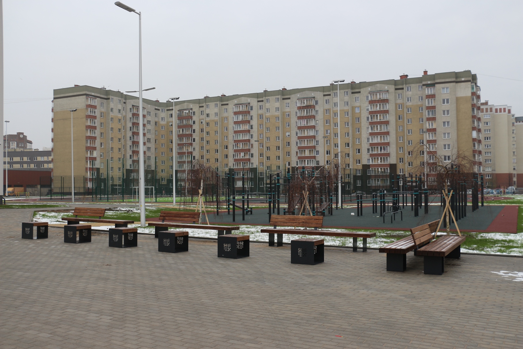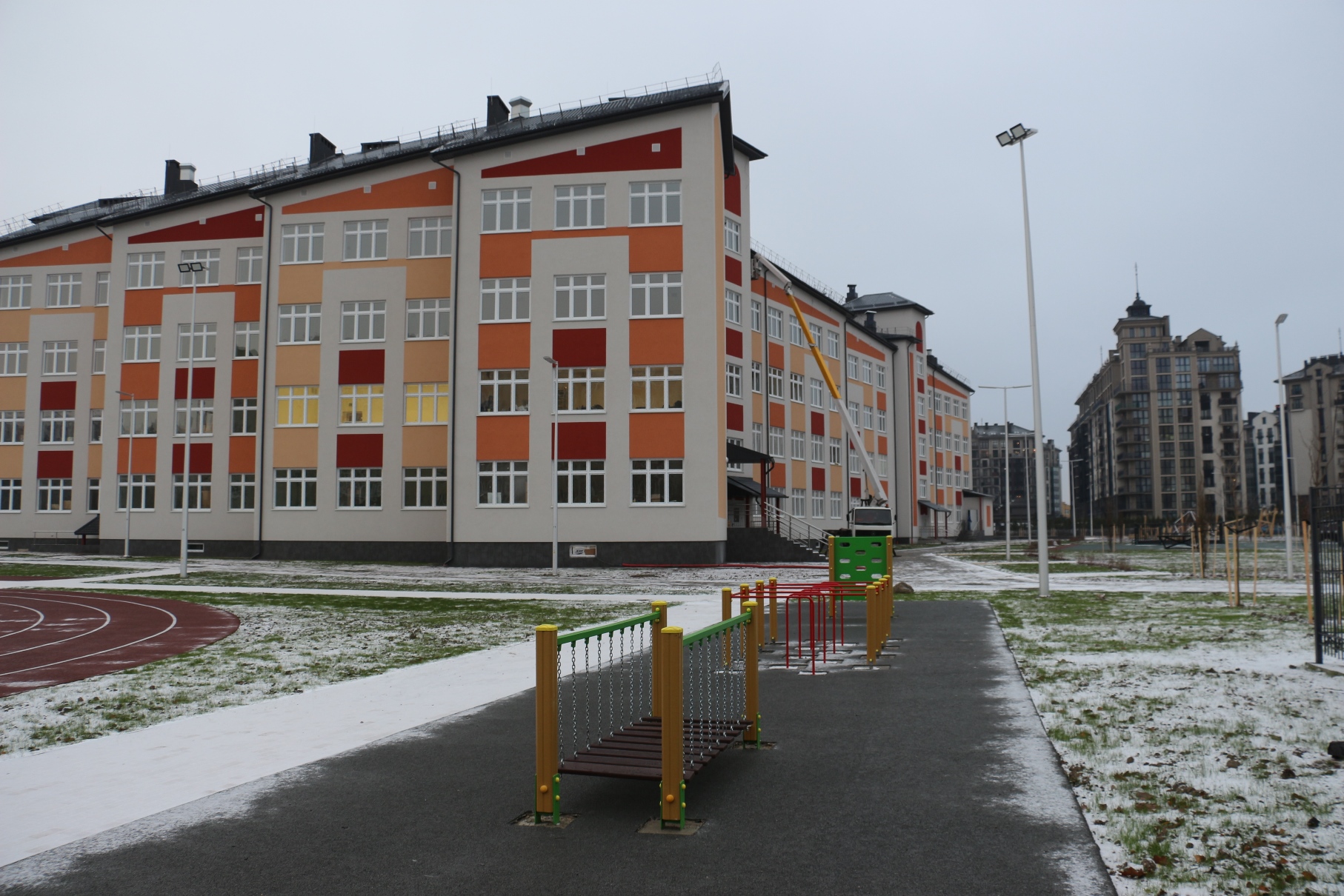 А рядом со школьным зданием размещено большое спортивное ядро с беговыми дорожками, с различными силовыми элементами, полосой препятствий для сдачи норм ГТО.