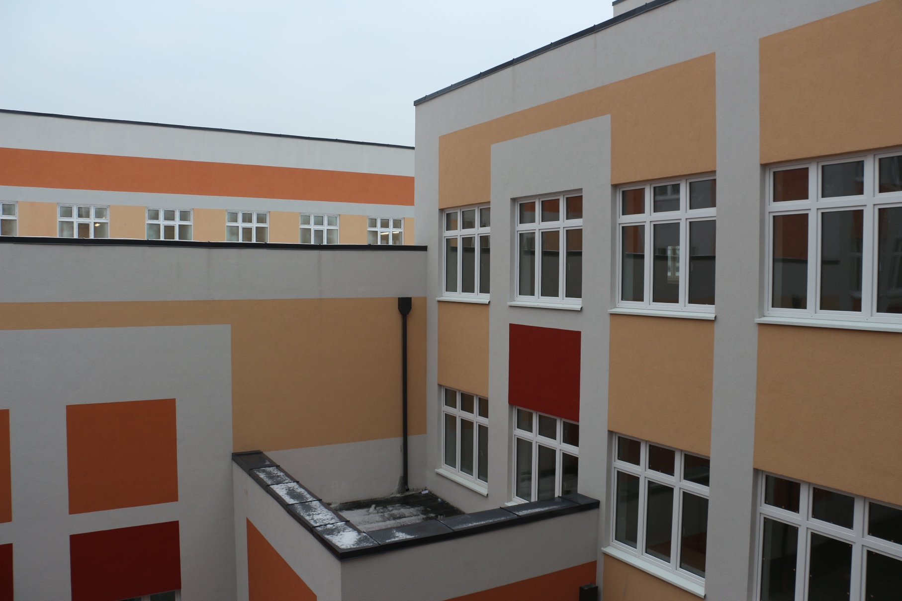 Строители работали в очень плотном режиме. Автономная газовая котельная, запущенная в ноябре, обеспечила подачу тепла в здание, что дало возможность выполнять оперативно отделочные работы. Учитывая сжатые сроки, на этой стройплощадке работы по зданию, как внешние, так и внутренние, велись параллельно с благоустройством территории. Это создавало для подрядчика определенные затруднения. Но и с этой задачей подрядчик справился. Пришкольная территория приведена в полный порядок: выполнено все мощение, озеленение, установлены малые архитектурные формы, спортивные сооружения.