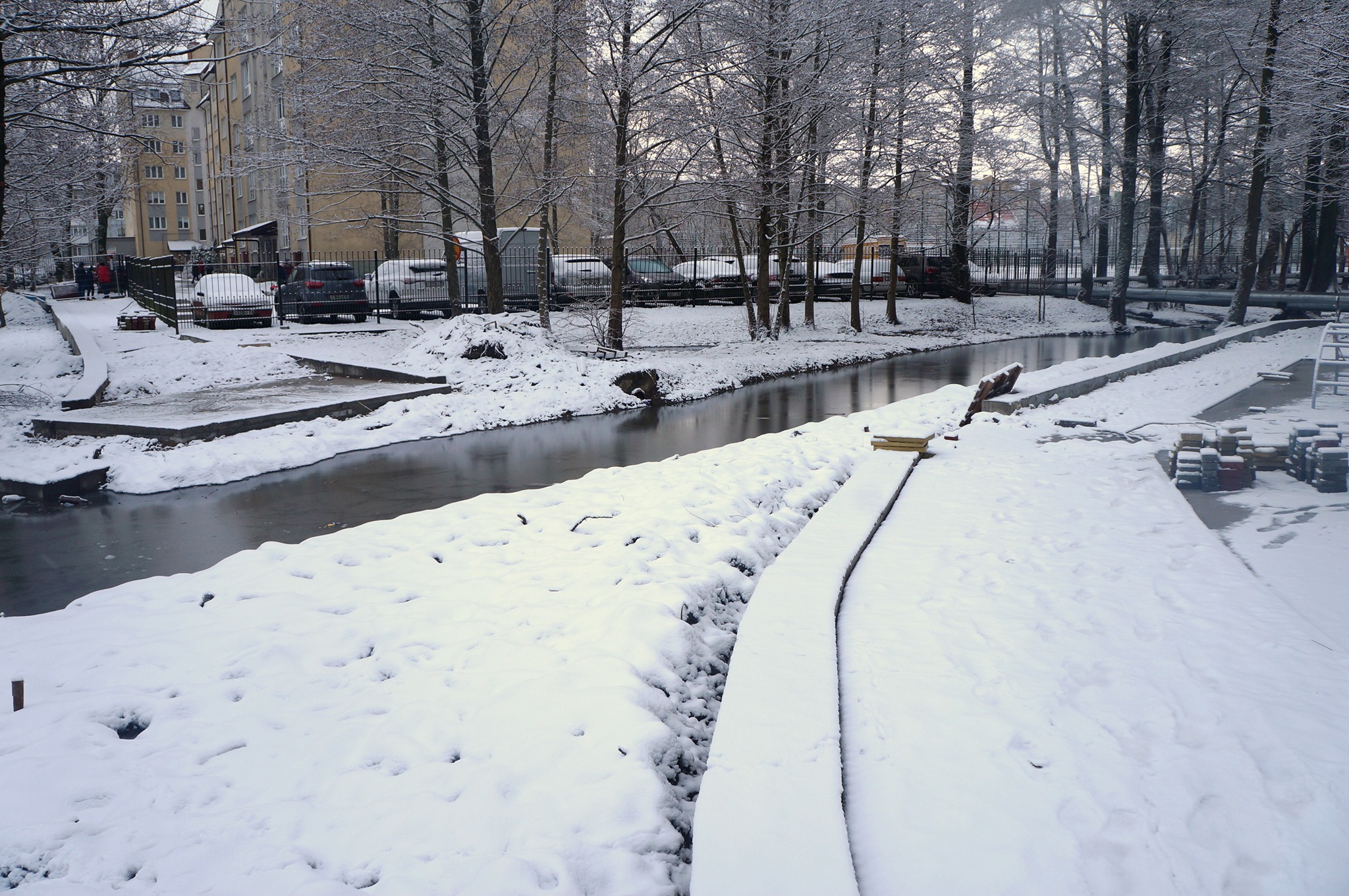 На части притока очистка донных отложений уже произведена, осуществлено берегоукрепление с применением георешетки. И, пока позволяла погода, подрядчик очень активно выполнял благоустройство. В целом по проекту должно быть выполнено почти полторы тысячи квадратных метров мощения в плитке, 240 квадратных метра резинового покрытия на участках, предназначенных для размещения игровых элементов для детей.