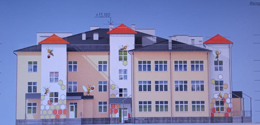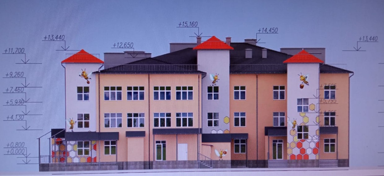 Будущий новый 3-этажный садик общей площадью более 4500 м 2 рассчитан на 185 детей, из них 60 мест предусмотрено для малышей в ясельных группах, которые будут располагаться на первом этаже. Новый корпус – это самостоятельное здание, здесь будет абсолютно автономное инженерное обеспечение, свой пищеблок, физкультурный и музыкальный залы, медицинский кабинет, кладовые и подсобные помещения, пост охраны, оснащенный видеодомофоном и технические помещения. Корпус будет оборудован лифтом, предусмотрено устройство пандуса и навес для колясок.