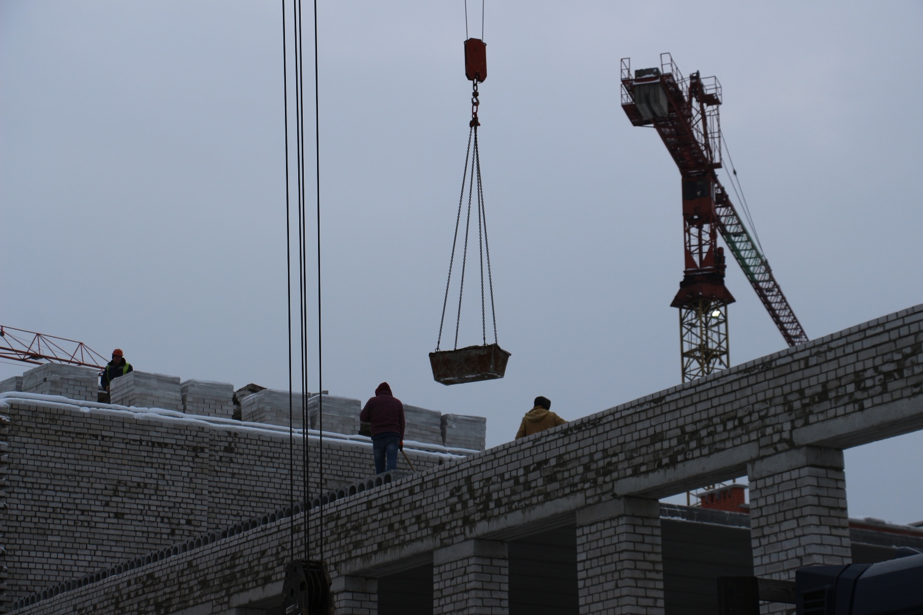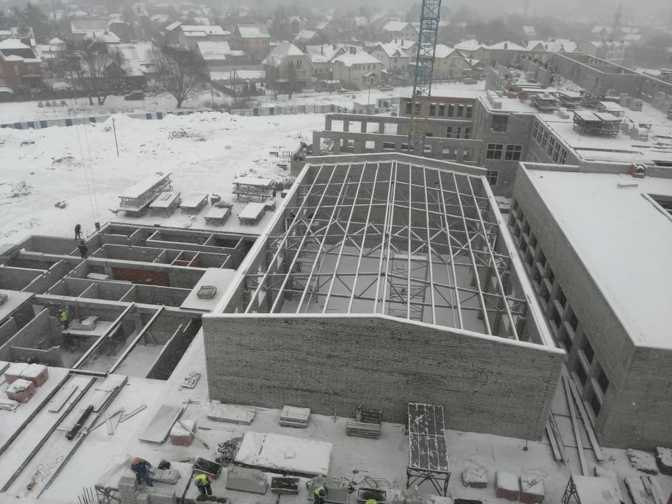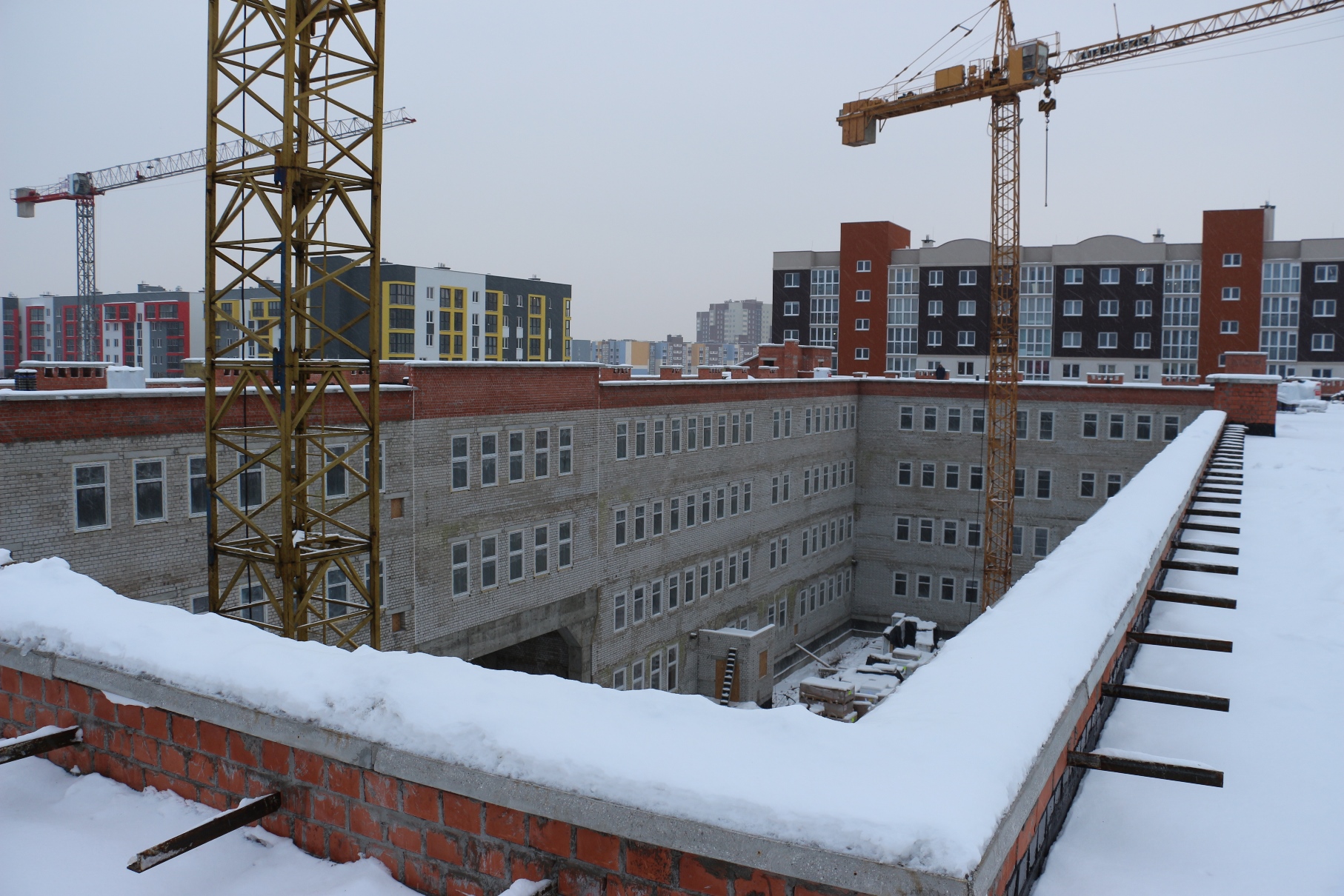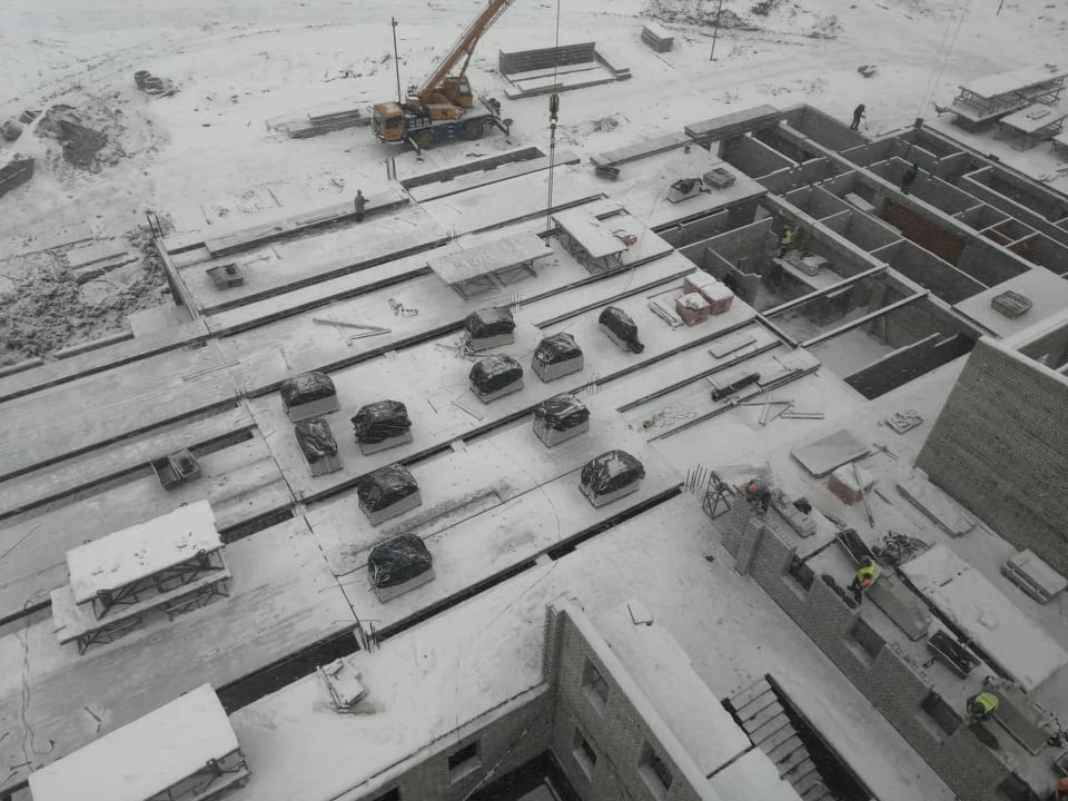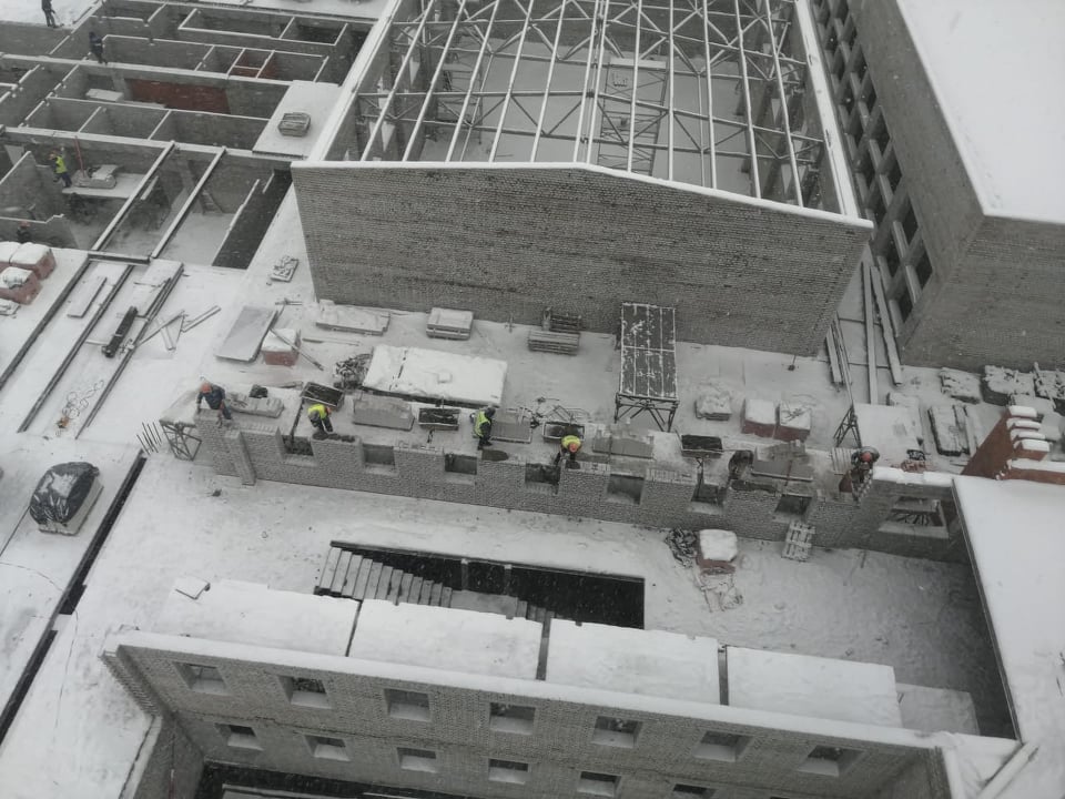 Сейчас на этой огромной стройплощадке завершается возведение стен 4 блока, в котором расположены спортивный и актовый залы. В корпусах, которые уже закрыты крышей, идут внутренние работы. Снег, лежащий на крыше, строителям не мешает. Уже готовый гидроизоляционный слой кровли надежно противостоит снегопаду и дождям.
