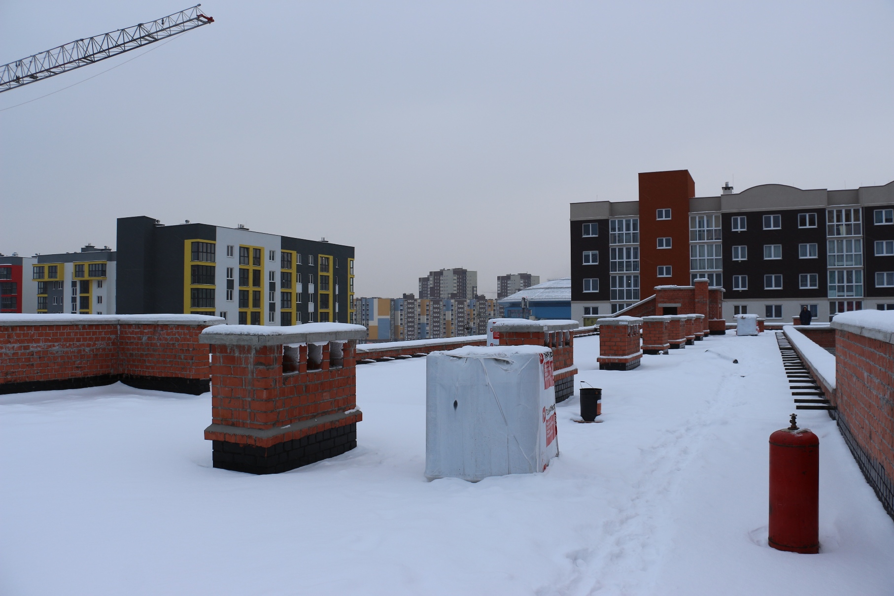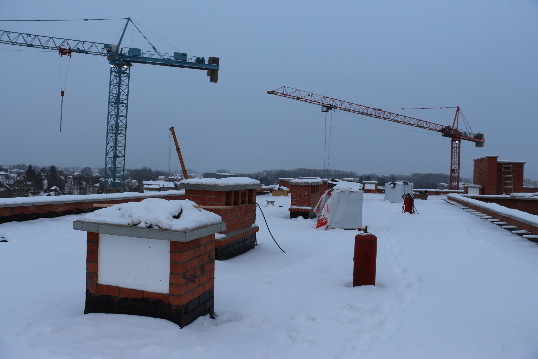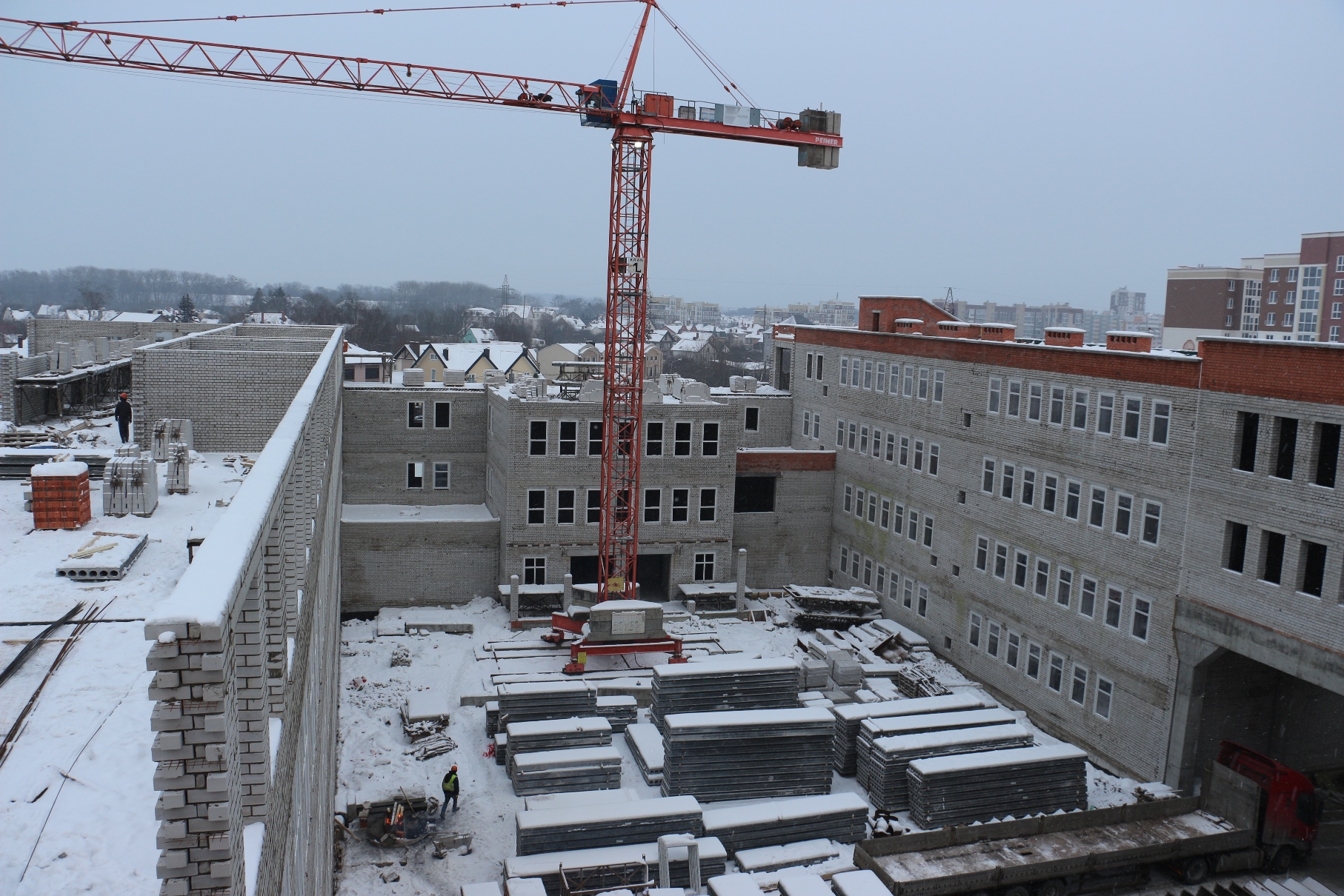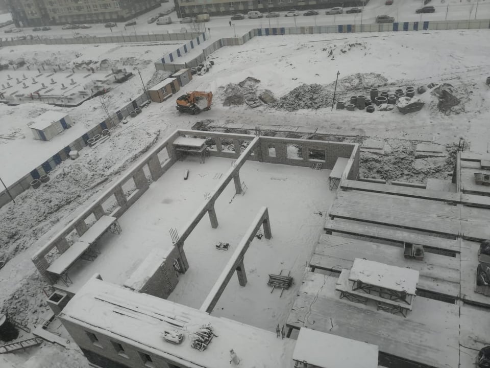 Сейчас на этой огромной стройплощадке завершается возведение стен 4 блока, в котором расположены спортивный и актовый залы. В корпусах, которые уже закрыты крышей, идут внутренние работы. Снег, лежащий на крыше, строителям не мешает. Уже готовый гидроизоляционный слой кровли надежно противостоит снегопаду и дождям.
