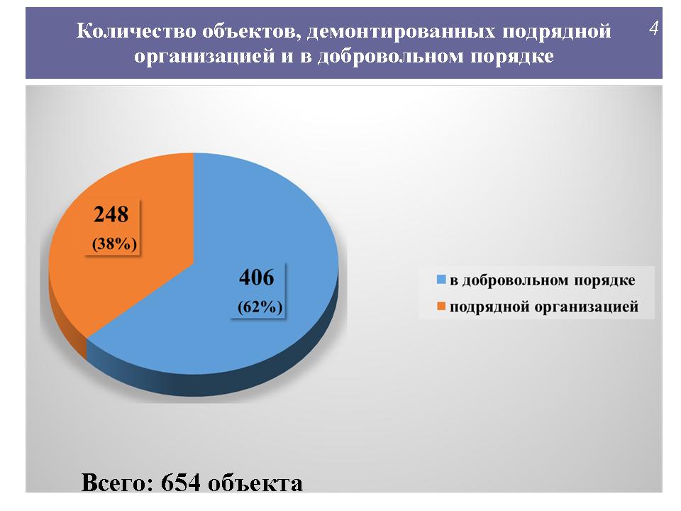С владельцами проводится предупредительно-профилактическая работа. Всего демонтировано 654 объекта, общим объемом 2 327,6 куб. м. На демонтаж силами подрядной организации выделено 1 903 900 руб. Добровольно демонтирован 1408,15 куб. м, что позволило сэкономить порядка 2 816 800 руб. средств бюджета.