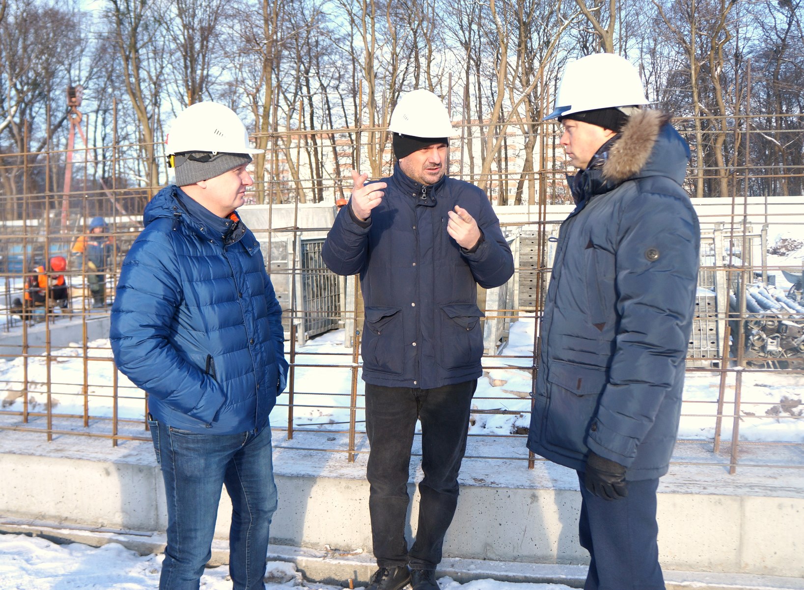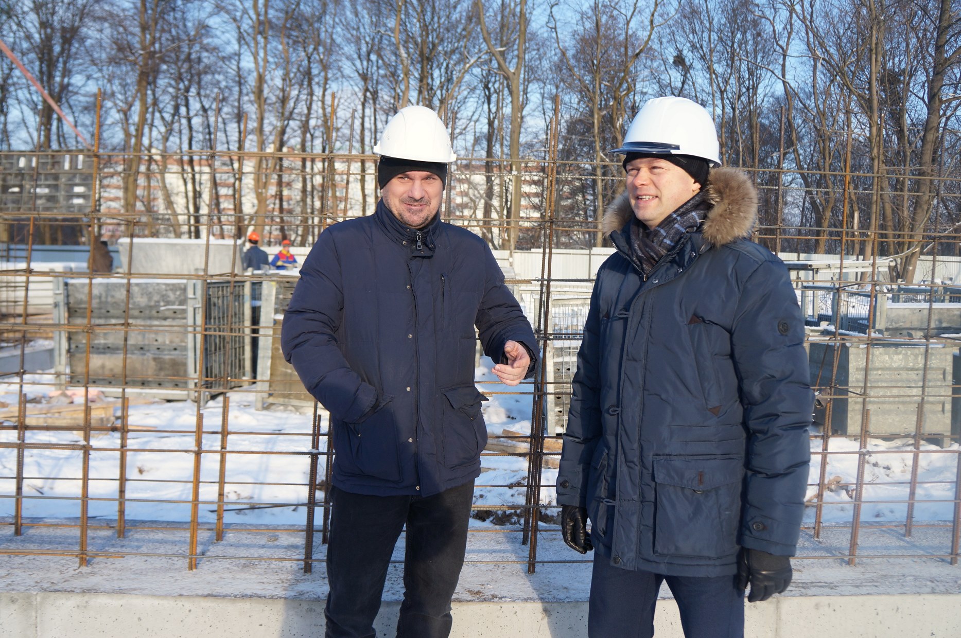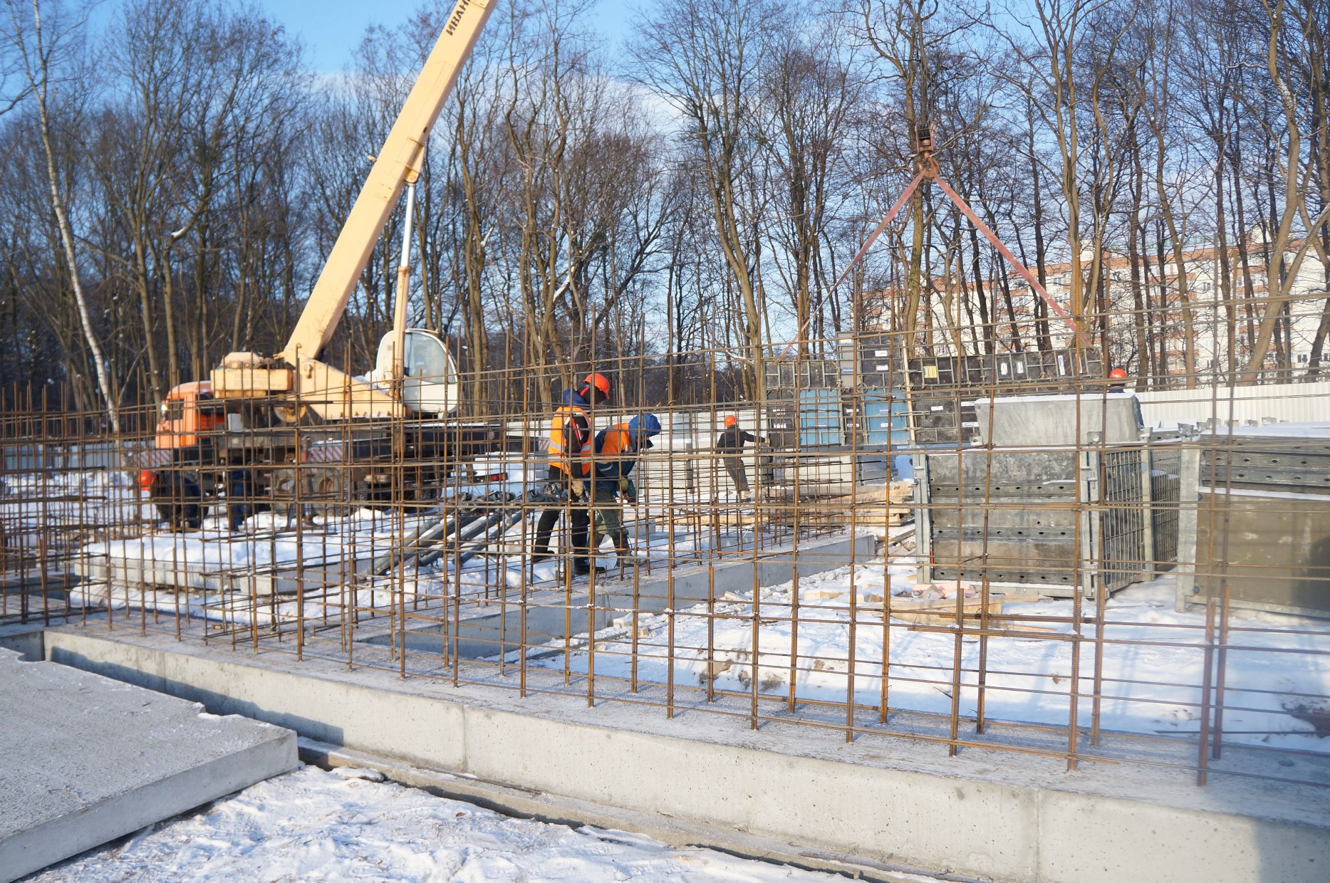 Рабочие заняты устройством каркасов под монолитный фундамент. Видеотрансляция строительства объекта ведется круглосуточно и доступна на сайте администрации. Об этом во время выездного совещания рассказал председатель КТРиС администрации Калининграда Артур Крупин.