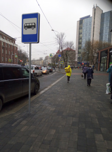 Сейчас городского транспорта ожидают у «Сбербанка», где нет возможности установить павильон со скамейками. В связи с этим чуть дальше, за остановкой загородных автобусов, оборудовали заездной карман и установили знак «Место остановки автобуса» для муниципальных маршрутов.