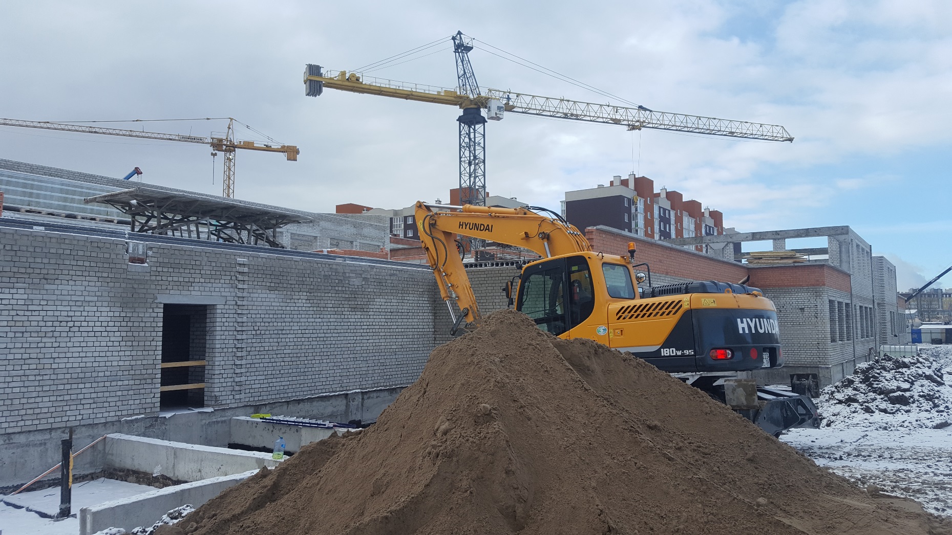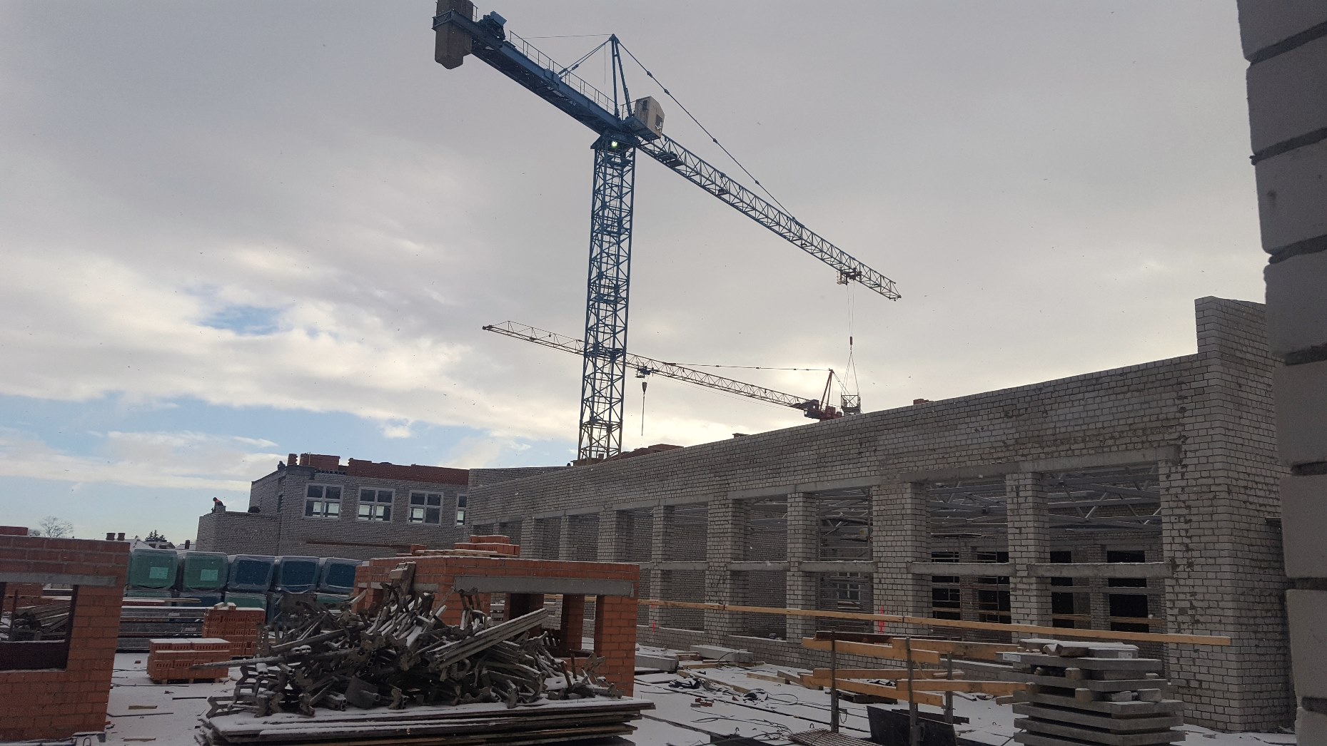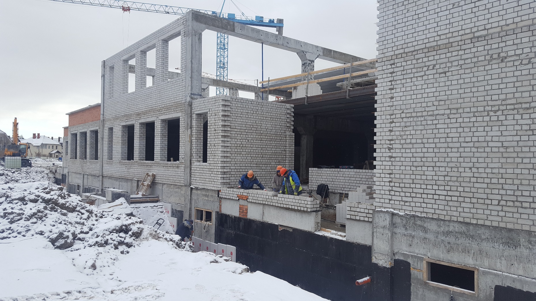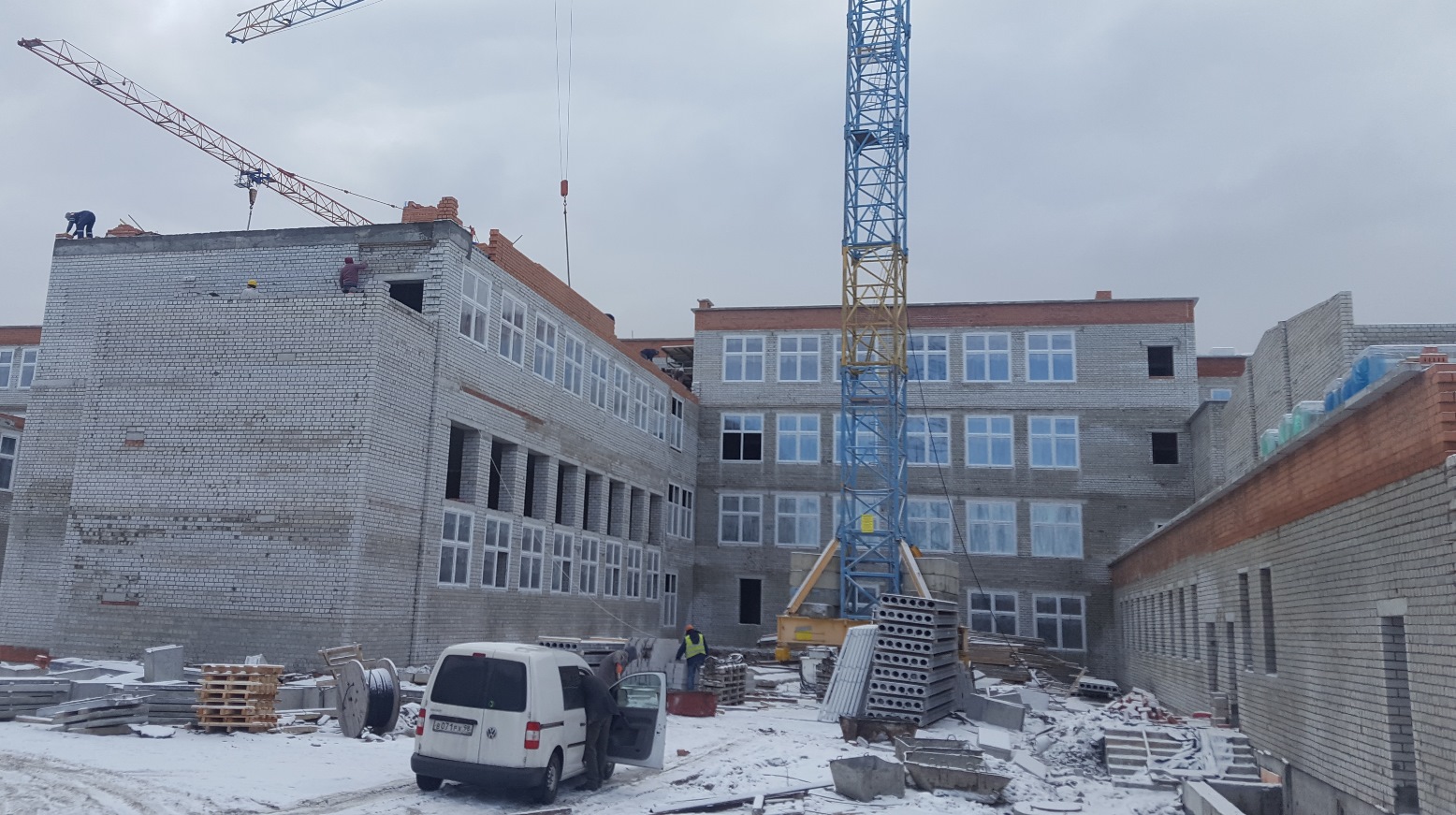 Стоит задача ввести школу в эксплуатацию до конца этого года. Хотя погода вносит свои коррективы, осложняя работу, строители предпринимают все меры, чтобы деятельность на объекте не прекращалась. Например, для проведения фасадных работ используют тепловые пушки и пленку, создавая допустимую по технологии температуру для этих работ.