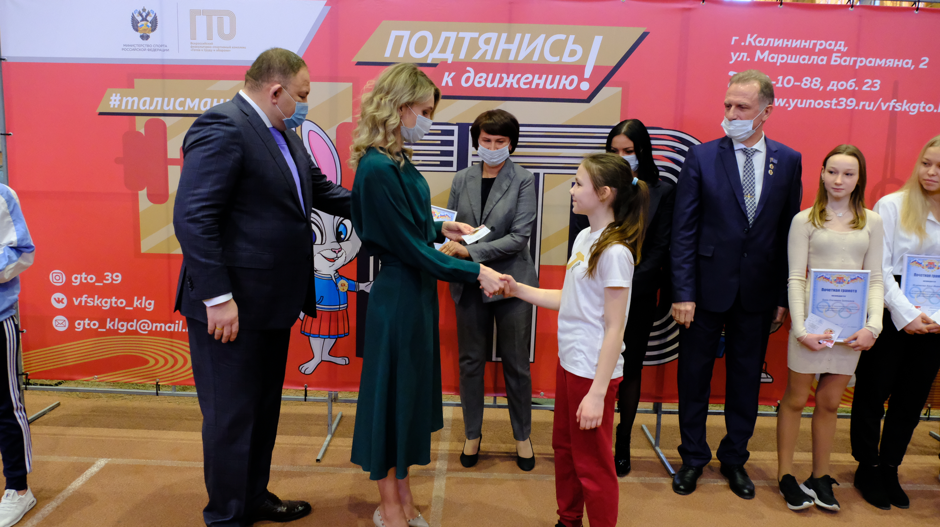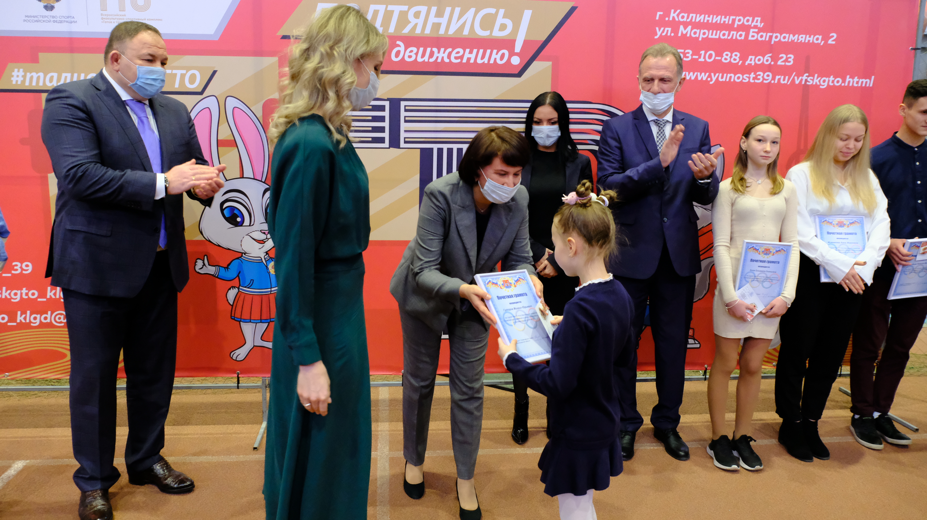 В начале мероприятия состоялась торжественная церемония вручения удостоверений и знаков отличия Всероссийского физкультурно-спортивного комплекса «Готов к труду и обороне», а также Почетной грамоты от Олимпийского Совета Калининградской области десяти калининградцам.