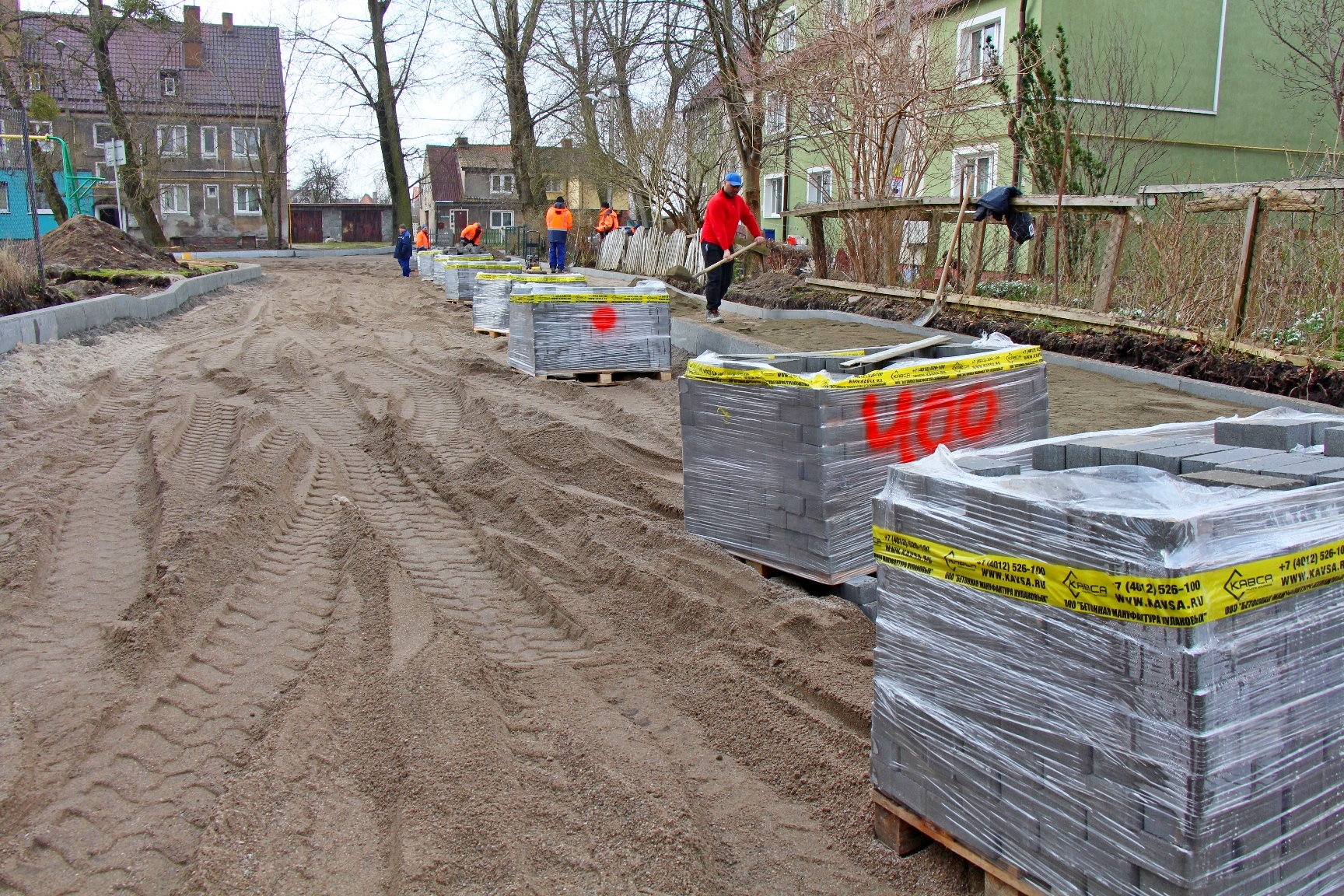 На ул. Баумана рабочие выкладывают плиткой тротуары. Этой детали городского ландшафта на улице в старом Шпандине никогда не было, а проезжая часть ещё недавно представляла собой почти 200-метровой длины лужу. Сейчас бортовой камень уже обозначил границы обновлённой дороги, в основании которой уже уложена песчаная подушка.