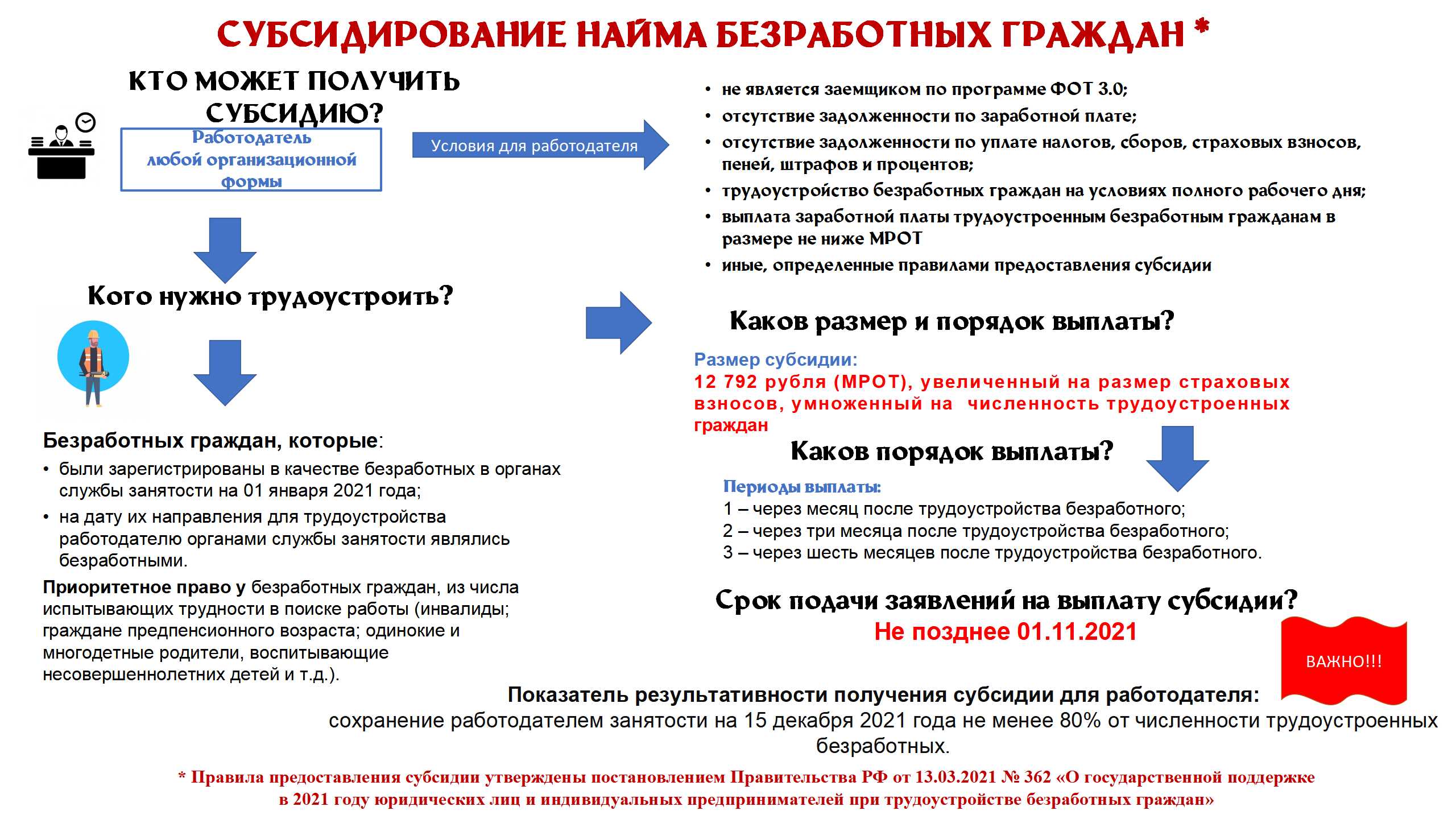 - постановление Правительства Российской Федерации от 13.03.2021 № 362 «О государственной поддержке в 2021 году юридических лиц и индивидуальных предпринимателей при трудоустройстве безработных граждан».