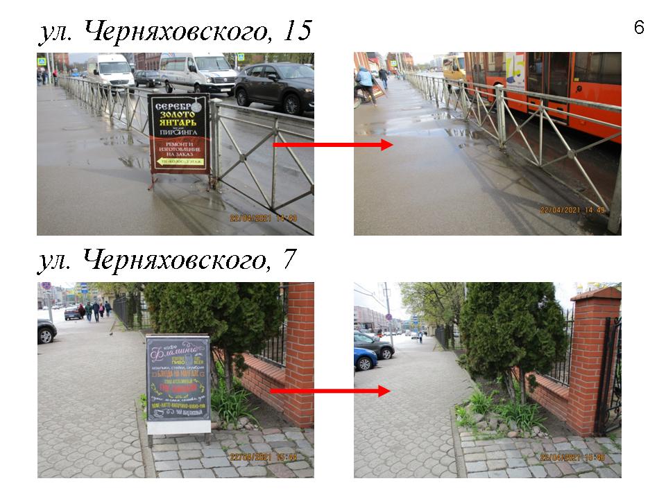 № 160 по ул. Багратиона, № 176 по ул. Подп. Емельянова, на пересечении ул. Фрунзе с ул. Кирпичной. За отчетный период в результате проведённой комитетом работы в добровольном порядке демонтирован 1 НТО, ранее размещенный на территории общего пользования в районе дома № 160 по ул. Багратиона.
